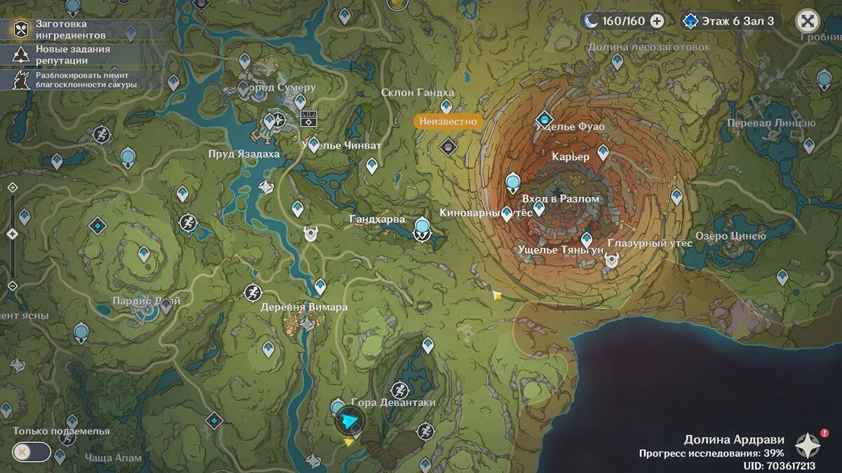 Пятая область поиска сокровищ находится между поселением Гандхарва и Киноварным утёсом. Телепортируйтесь к статуе Дендро Архонта в этой области и экипируйте поисковую фею.