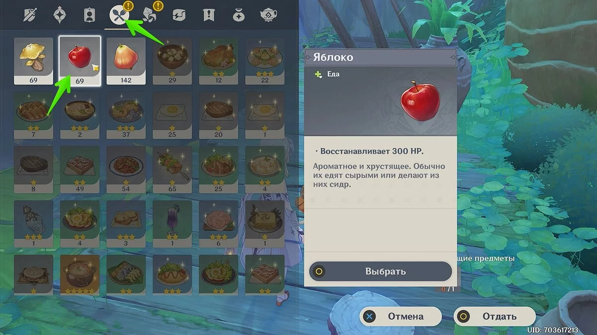 Примечание: Яблоко можно выбрать в разделе «Еда».