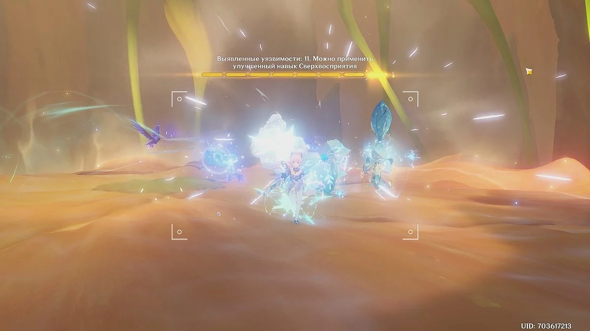 Сперва мы рекомендуем использовать элементальные навыки и взрыв стихий всеми доступными персонажами. Это позволит накопить достаточно энергии для активации эффекта «Сверхвосприятие» три раза подряд. Примените навык в четвёртый раз, чтобы гарантированно выполнить все поручения и получить награды.