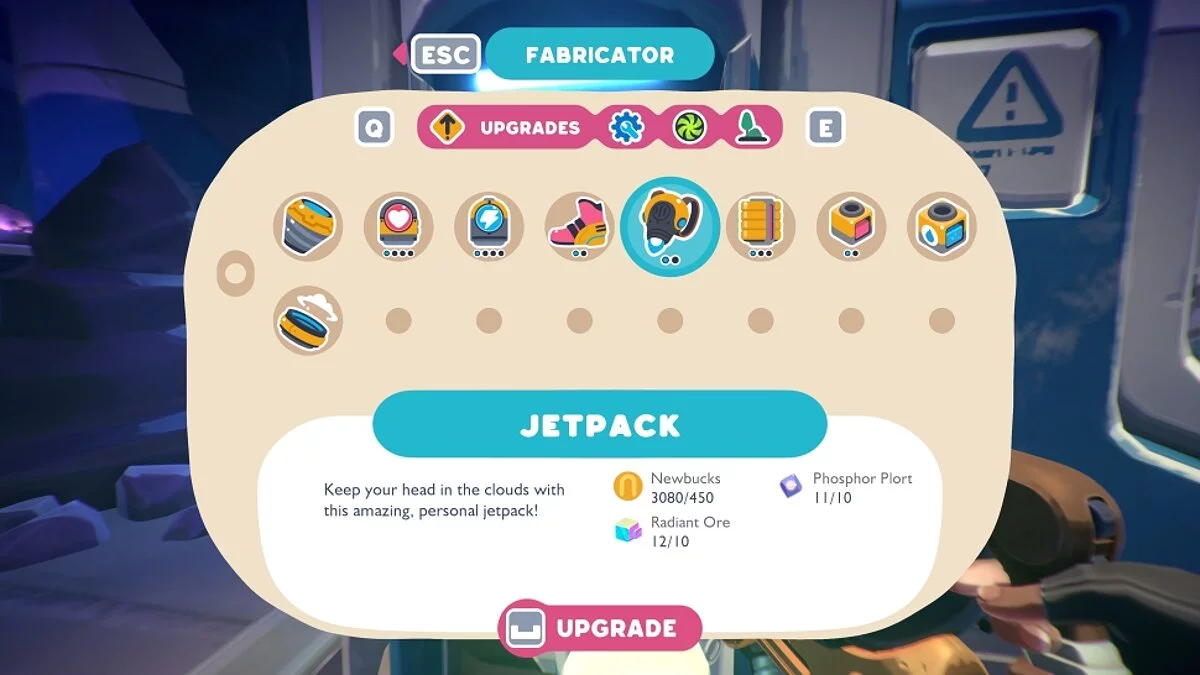 Доставьте к фабрикатору нужное количество и изготовьте реактивный ранец (Jetpack). Также не забудьте добыть 10 единиц фосфорной руды (Phosphorus ore). Она представляет собой плод светящихся слаймов, которые водятся в Консерватории (Conservatory) только в ночное время. Используйте фрукты, чтобы накормить их, а затем возьмите ресурсы для фабрикатора. Для создания реактивного ранца также понадобится заплатить 450 единиц валюты.