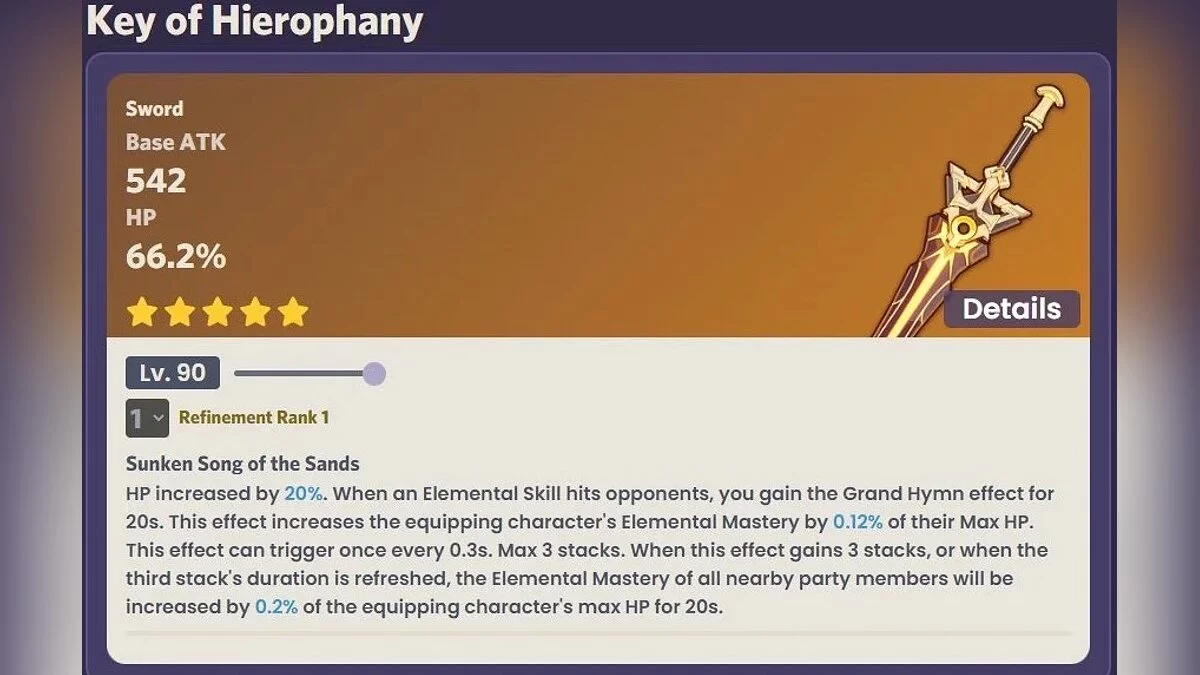 Ключ Хадж-нисут — пятизвездочный одноручный меч, увеличивающий показатель здоровья и мастерства стихий. Базовый урон до 542 единиц, а дополнительное увеличение здоровья до 66,2%. Меч повышает здоровье на 20%. Если хозяин оружия попадает элементальным навыком по врагу, появляется эффект «Великое сказание» и его мастерство стихий повышается на 0,12% от максимального здоровья. Данный бонус даётся не чаще 1-го раза в 0,3 секунды и суммируется до 3-х раз. После получения 3 уровней или обновления длительности 3 уровня мастерство стихий всех персонажей в команде увеличится на 0,2% от максимального здоровья хозяина меча на 20 секунд.