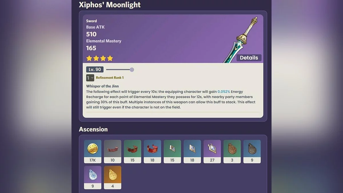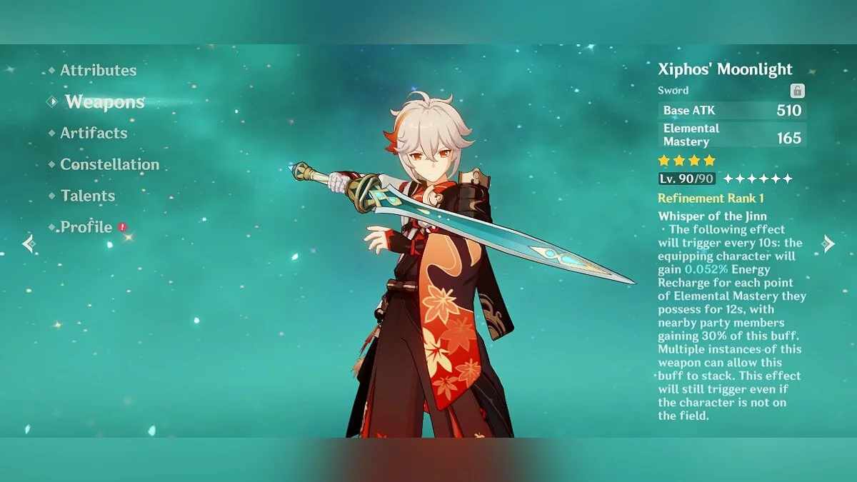 Лунное сияние ксифоса — четырехзвездочный одноручный меч, который повышает восстановление энергии как хозяина, так и всего отряда. Его базовая атака доходит до 510. Дополнительно меч увеличивает мастерство стихий до 165. Основная способность — каждые 10 секунд увеличивает восстановление энергии хозяина на 0,036% за каждую единицу его мастерства стихий на 12 секунд. Члены отряда получают 30% от данного эффекта. Если мечом обладают и другие персонажи в команде, бонус складывается и срабатывает, даже если экипированный персонаж не на поле боя.
