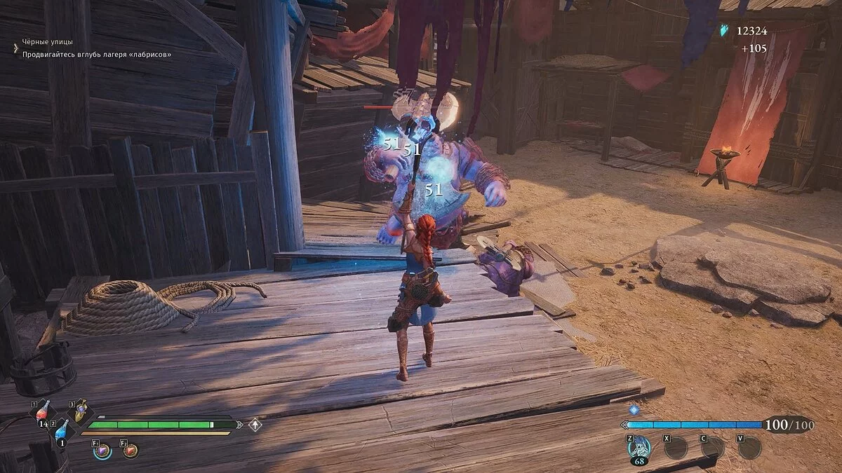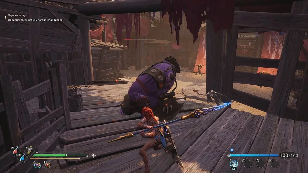 Теперь вы в лагере Лабрисов. Разберитесь с врагами и войдите в центральные ворота. Здесь вас ждёт битва с мини-боссом. Победите его, чтобы получить ключ и разблокировать проход.
