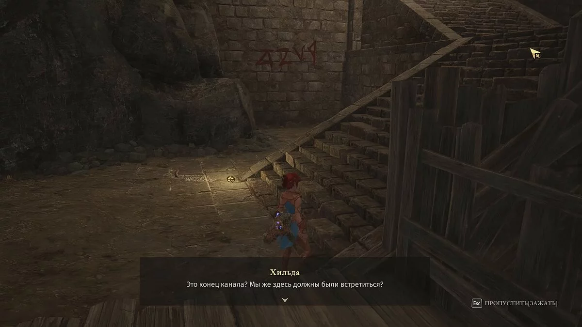 Вернитесь к стене, по которой вы спустились, и снова заберитесь на неё. Справа есть лаз — используйте его, чтобы спуститься ещё ниже.