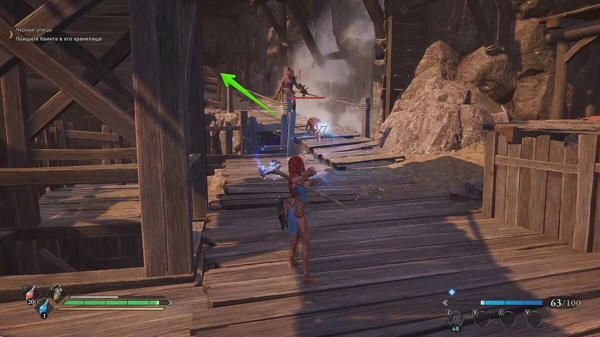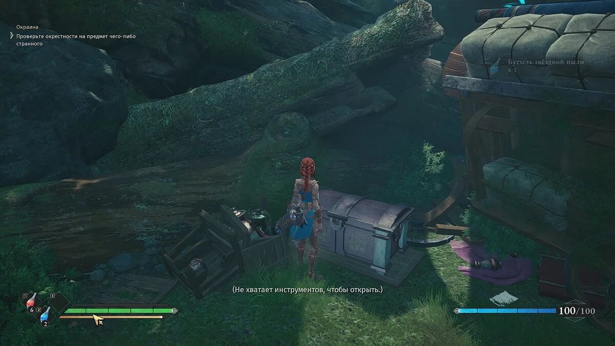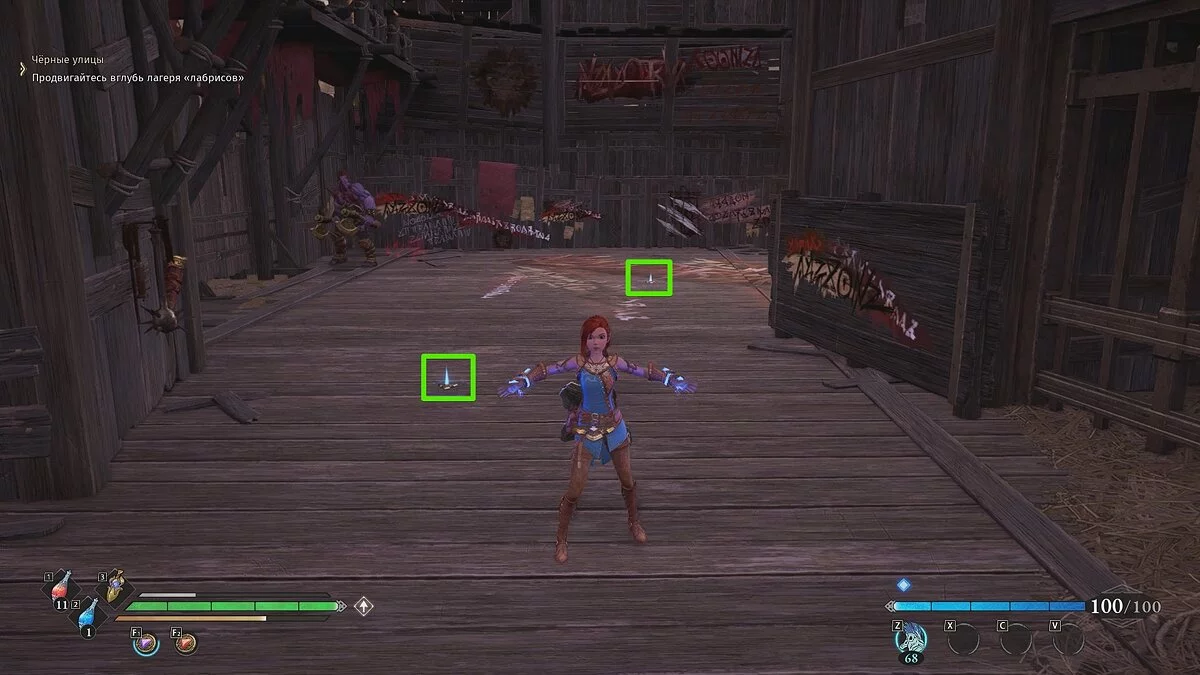 Прочтите записку (Особый приказ легиона) и подберите несколько пузырьков с бальзамом. Вы увидите монстра, который тащит оружие главной героини. Следуйте за ним и сразитесь с несколькими похожими существами. По дороге вы можете подобрать бутыль звёздной пыли — расходник, восстанавливающий магическую энергию, а также осмотреть запертый сундук. Без своих кинжалов вы не сможете его открыть. Рядом с сундуком будет лежать ещё одна заметка (Дневник беглеца №3).
