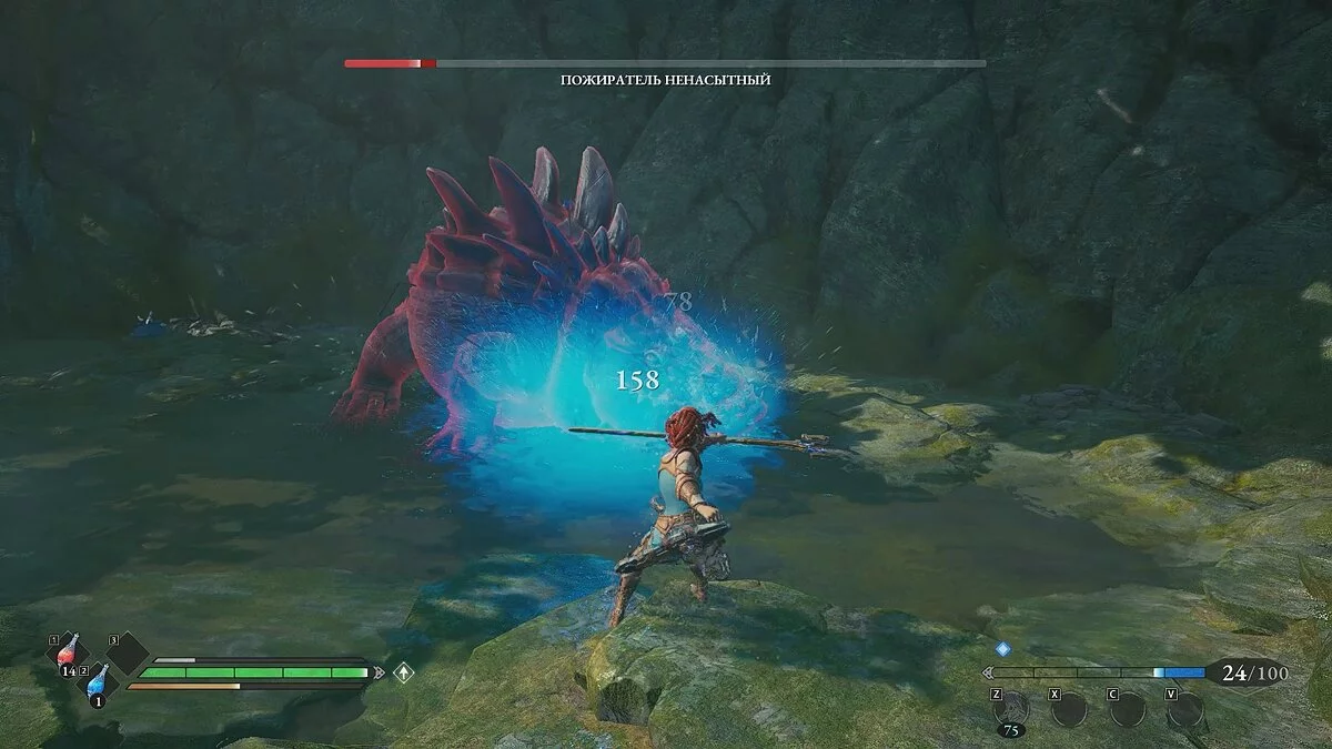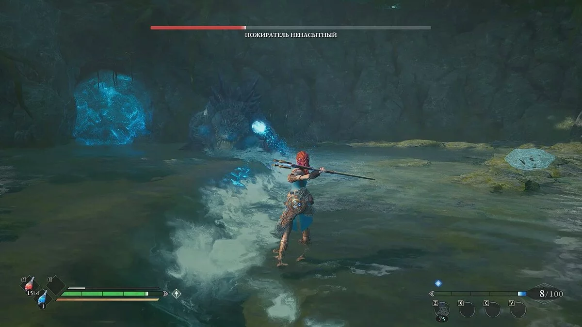 Если вы немного разобрались в управлении, то должны были понять, что вам нужно вовремя уворачиваться от ударов любых врагов. Пожиратель не исключение. Мы использовали меч и щит в связке с магическим посохом.