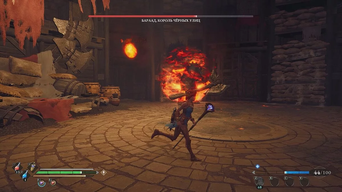 Босс довольно медлительный, поэтому можете использовать дальние атаки посохом и расставлять ловушки браслетами. Когда снимете Барааду одну треть здоровья, он станет атаковать огнём. Используйте кувырок, чтобы уворачиваться от ударов.