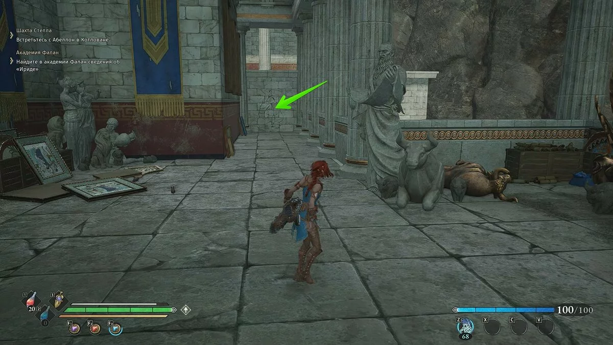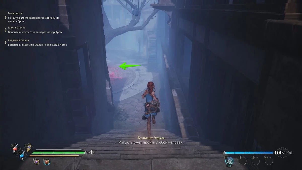 Заплатите первому жильцу 1000 единиц звёздной пыли, чтобы получить предмет «Собрание комедий Аристофана». После кат-сцены с огромной птицей продолжайте бежать вперёд. Ворота сверху будут заперты, их можно будет открыть позже. Поверните налево и отыщите культистов.