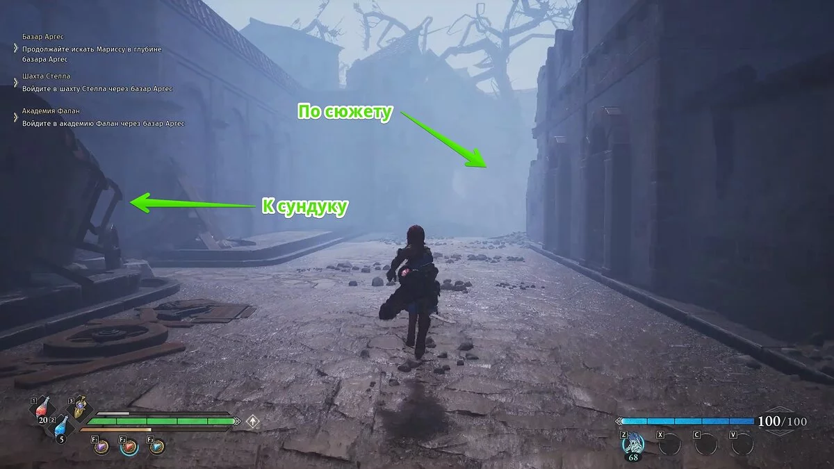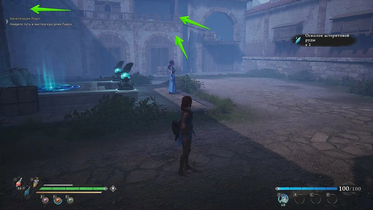 Вы наткнётесь на два здания с несколькими монстрами. В здании справа можно найти сундук и подобрать осколок астеритовой руды. Вернитесь обратно и бегите наверх по лестнице. По пути вы встретитесь с незнакомцем, который позже назовёт своё имя. Здесь сверните направо, чтобы оказаться на открытой локации со множеством врагов.