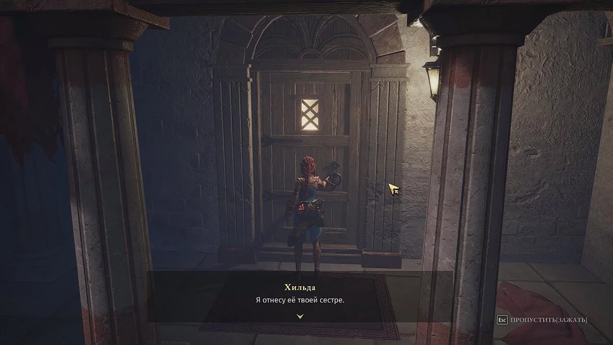 Не спешите следовать в Амфитеатр. Вернитесь немного назад и проследуйте по дороге направо. Здесь вы сможете открыть срез. Для этого взаимодействуйте с воротами. Также постучитесь в единственную дверь и возьмите ещё одно поручение. Слева есть лестница, ведущая на балкон с сундуком.