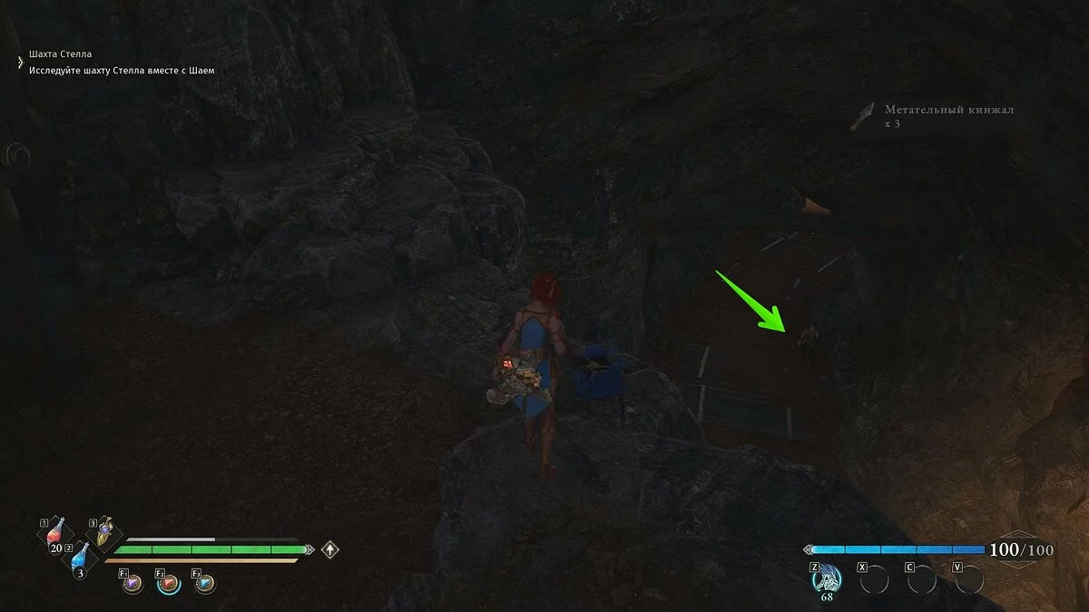Бегите по пещере и постарайтесь быстро убить безобидное существо. Так вы получите Эликсир утренней звезды. Продолжайте следовать вперёд, пока не доберётесь до обрыва. Возьмите здесь осколок этерита и спрыгивайте вниз.