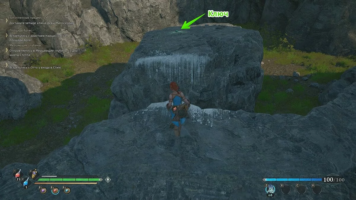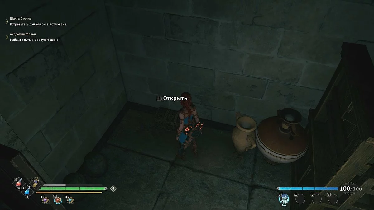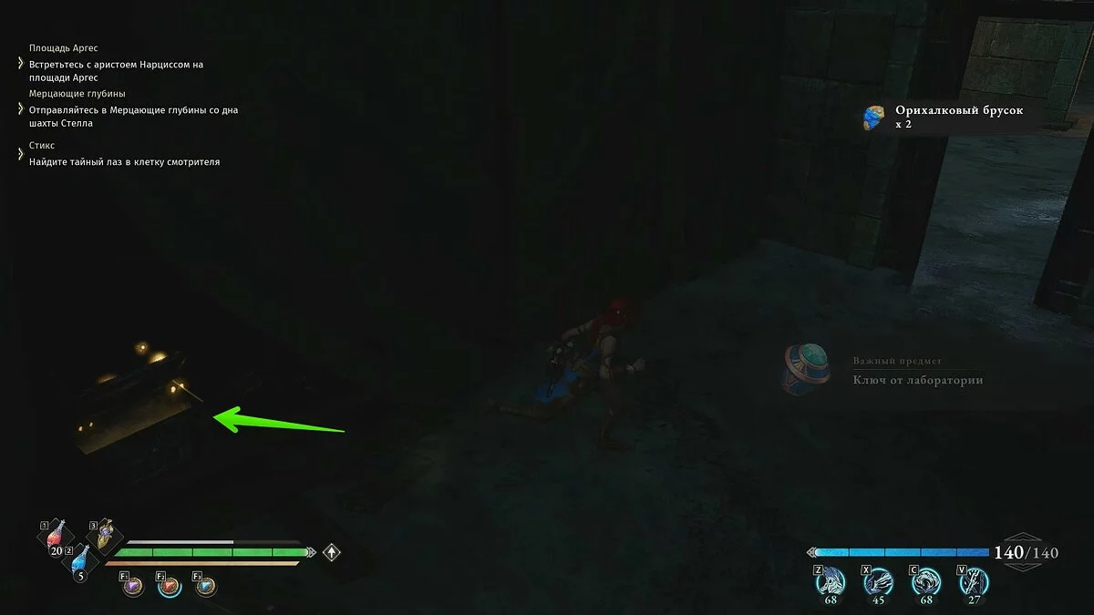Пройдите в левую часть подземелья и отыщите решётку, которая ведёт к лестнице. Справа от неё есть неприметный сундук. Осмотрите его, чтобы получить ключ от верхнего этажа.