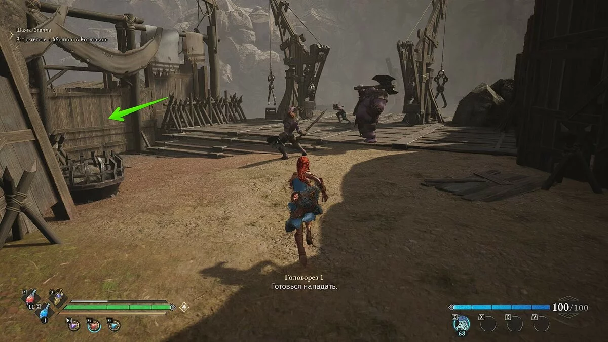 У обрыва вы увидите нескольких головорезов и запертые ворота слева. Разберитесь с врагами, затем постучите в ворота. Побеседуйте с Абеллон, спускайтесь на нескольких лифтах вниз. По пути вы будете встречать собак и головорезов — убивайте их. На самом нижнем уровне есть вход в шахту. Как только вы войдёте внутрь, на вас нападёт парень по имени Шай. Следуйте за ним.