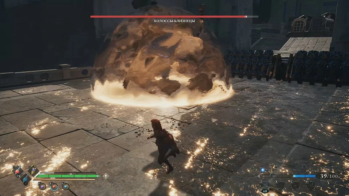 Войдите в Амфитеатр и поднимитесь на второй этаж по лестницу справа. Здесь есть сундук. Затем по левой лестнице бегите на крышу. Босс снова начнёт преследовать героиню. Обращайте внимание на деревянные заграждения, которые можно разрушать при помощи посоха.