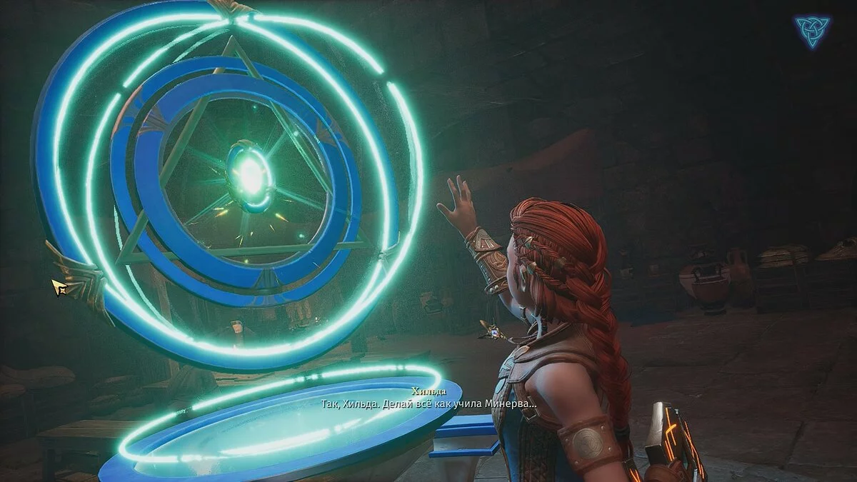 Взаимодействуйте с устройством между двух ворот, чтобы вернуться к Миневре и завершить квест.