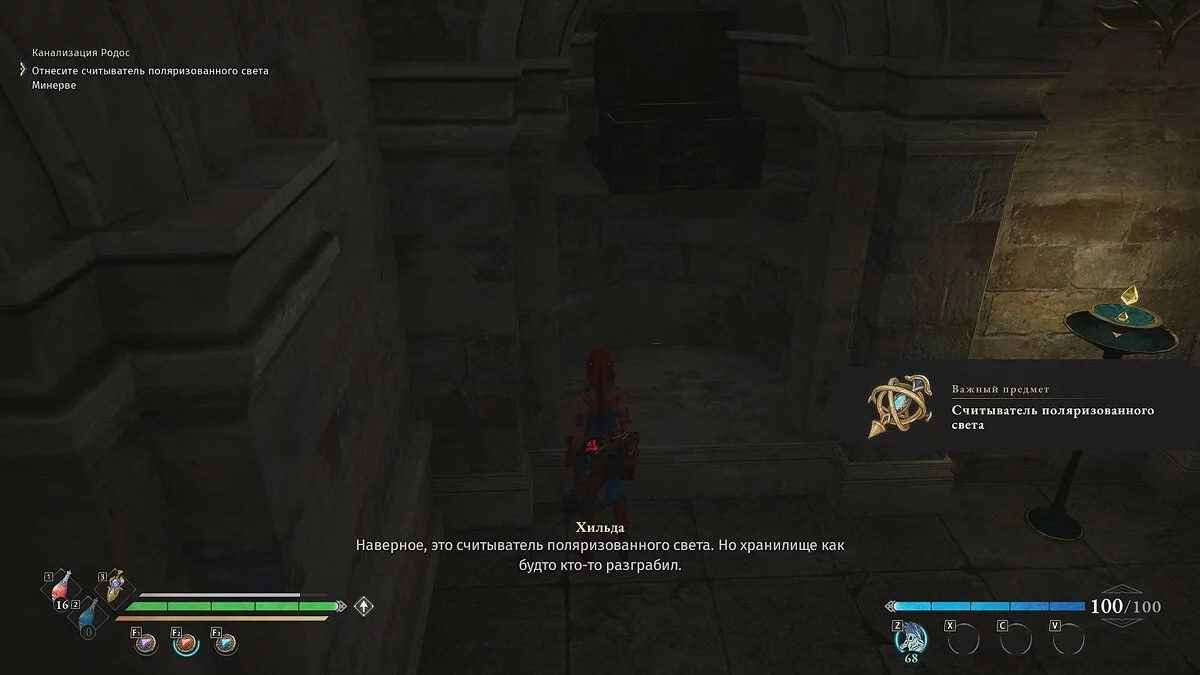 Подойдите к печати, чтобы использовать ключ и пробраться в потайную комнату. Здесь осмотрите единственный сундук и заберите сюжетный предмет «Считыватель поляризованного света».