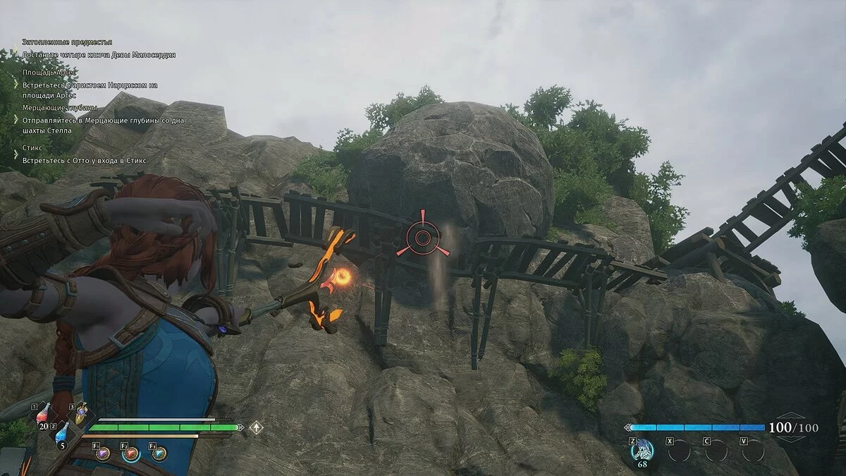 Вы также можете сбросить огромный валун, выстрелив посохом по удерживающим его балкам, чтобы осмотреть локацию и отыскать несколько ценных ресурсов.