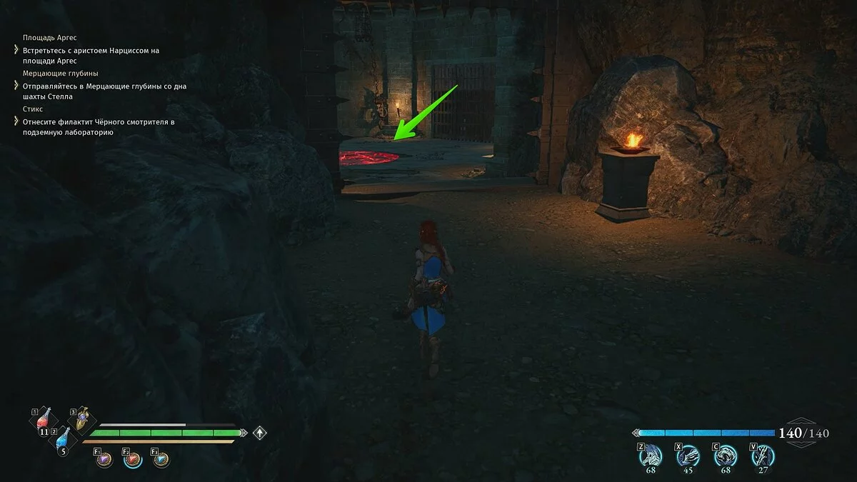 Вернитесь на базар Аргес и доберитесь до Гражданской площади. Она находится недалеко от входа в Убежище. Здесь вы увидите развилку. Дорога налево ведёт к Амфитеатру. Бегите направо и доберитесь до туннеля, в котором горит волшебный огонь. Потушите его при помощи ледяного умения героини (вы получили его перед тем, как попасть в Амфитеатр).