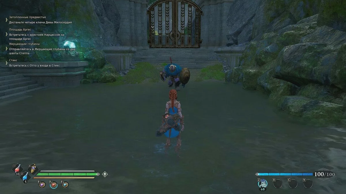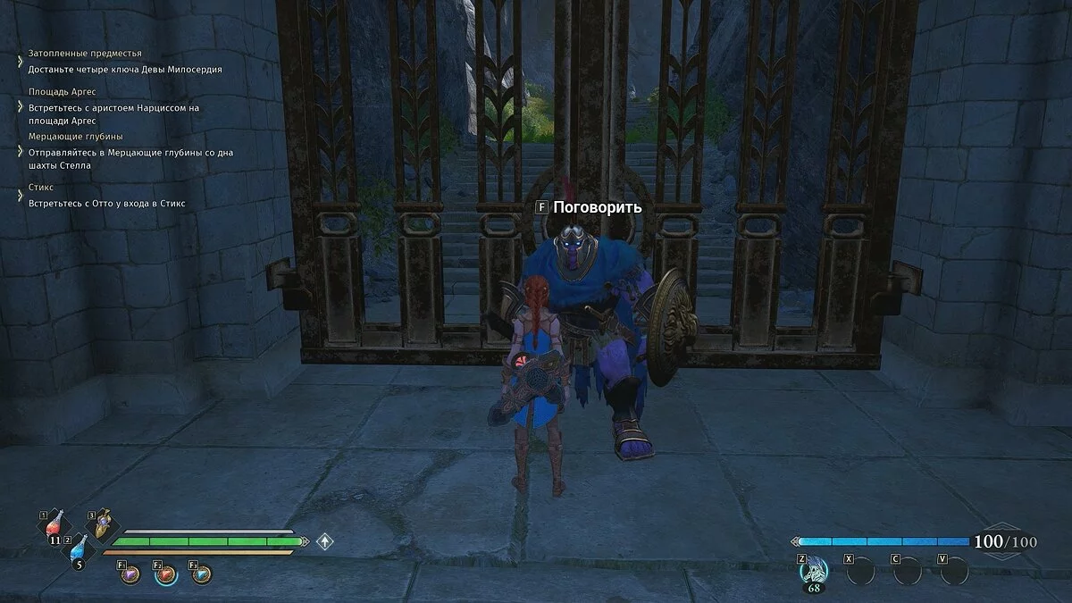 Бегите по коридору налево и открывайте решётки краеугольным ключом.