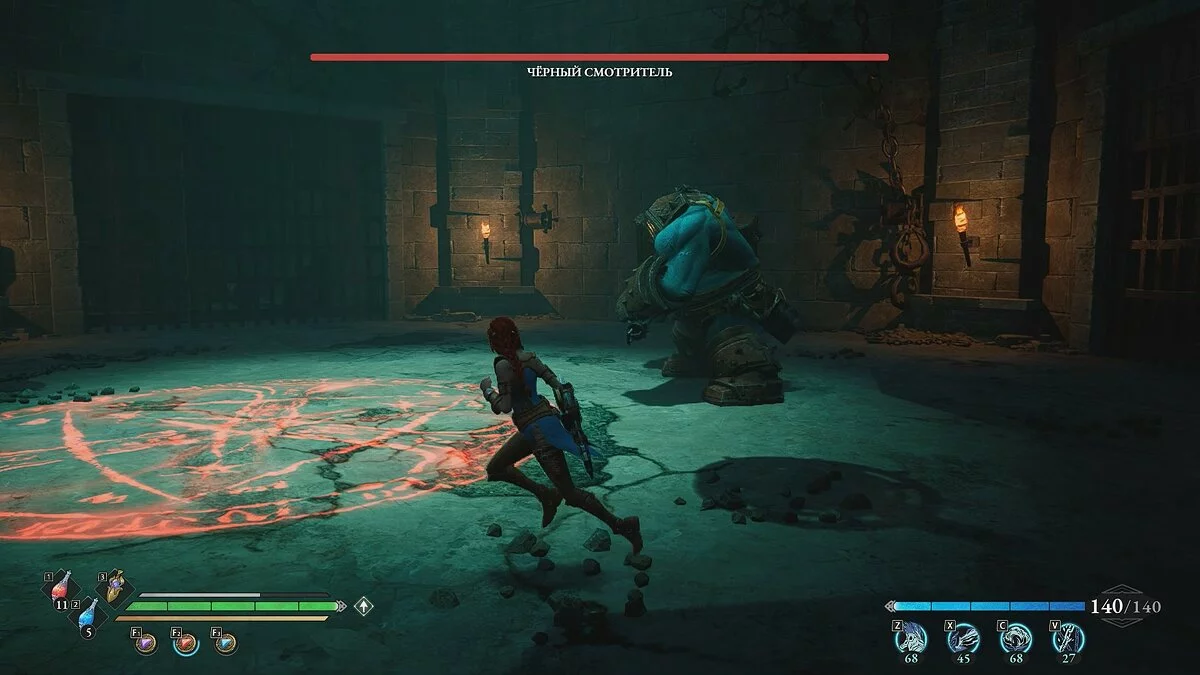 Исследуйте камеры и отыщите несколько важных предметов. Даже если вы что-то пропустили, то сможете вернуться сюда позднее. Бегите по рунам синего цвета, чтобы добраться до красной печати. Взаимодействуйте с ней и призовите босса.