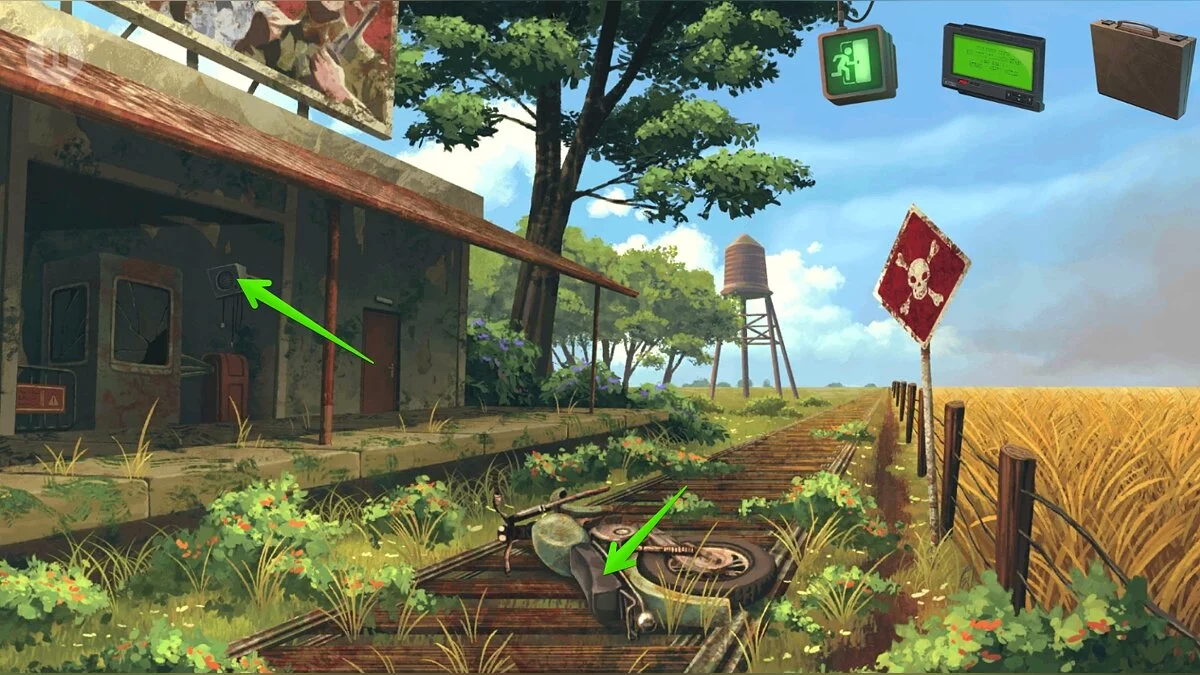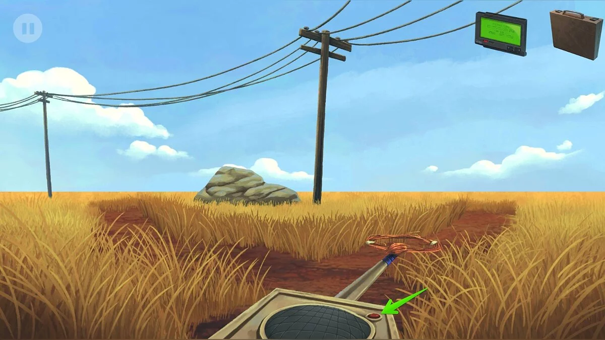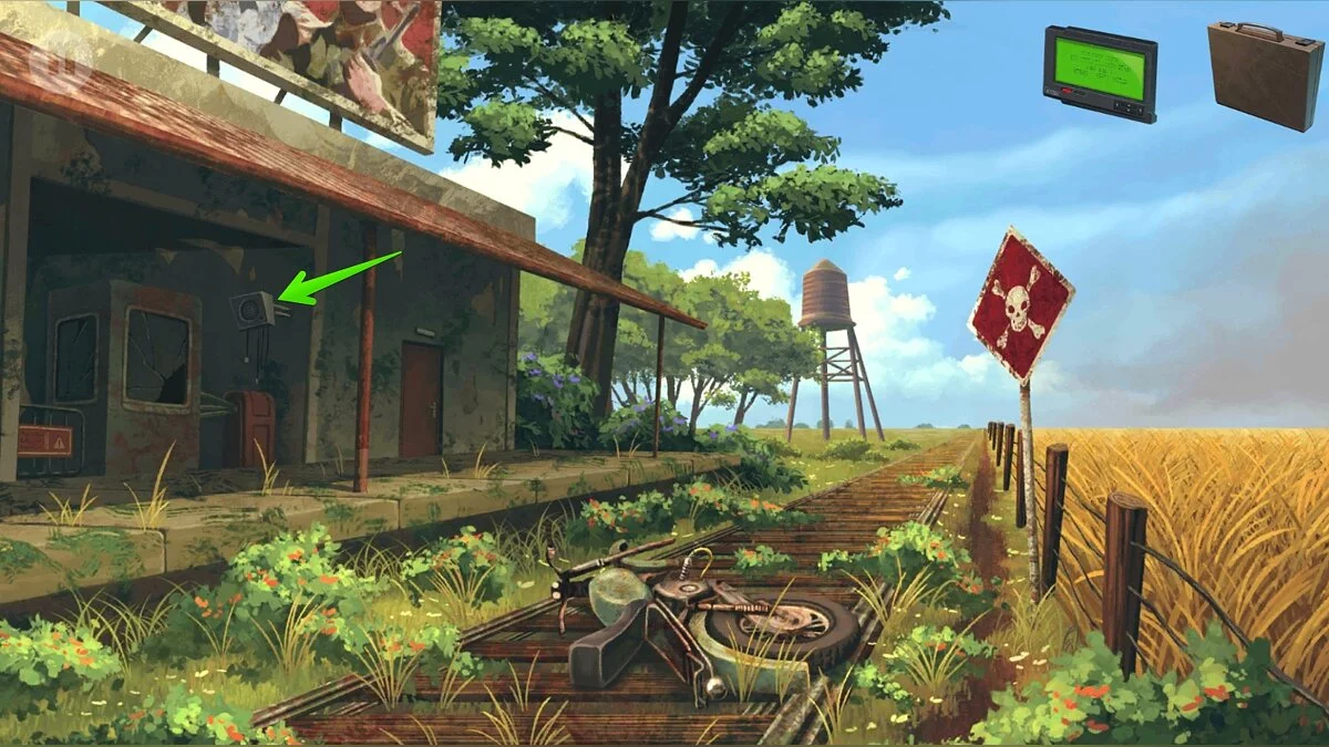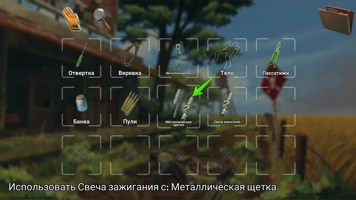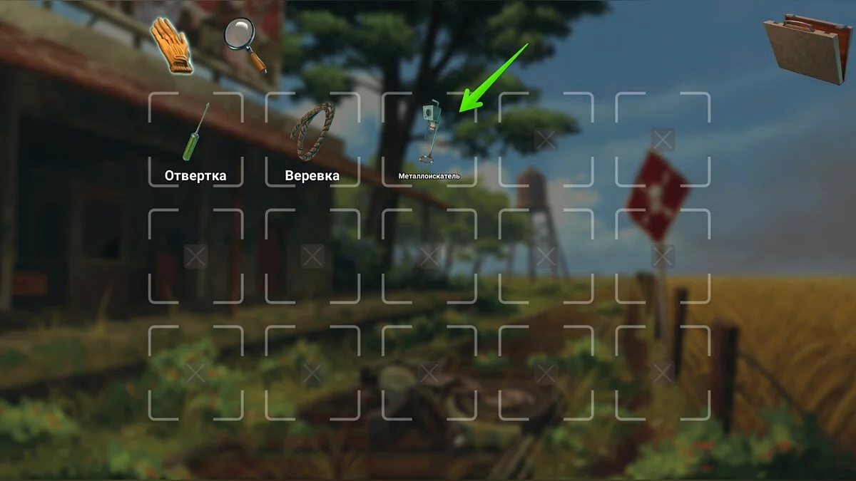 Открываем сиденье мотоцикла, забираем аккумулятор. Заходим в здание, подбираем отвертку, провод и веревку. Возвращаемся на улицу. Используем отвертку на старой колонке. Соединяем провод, колонку и аккумулятор, получаем металлодетектор. Используем его на минном поле.