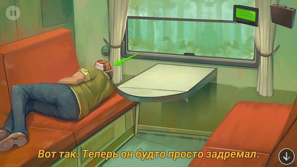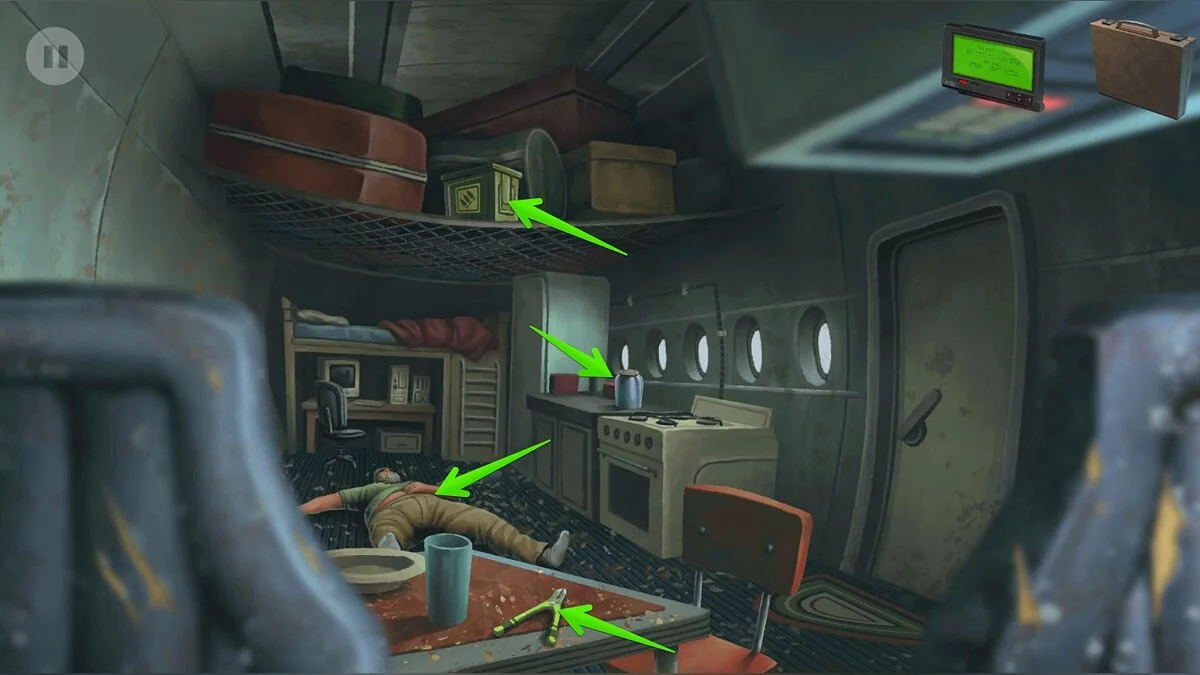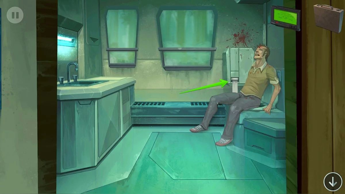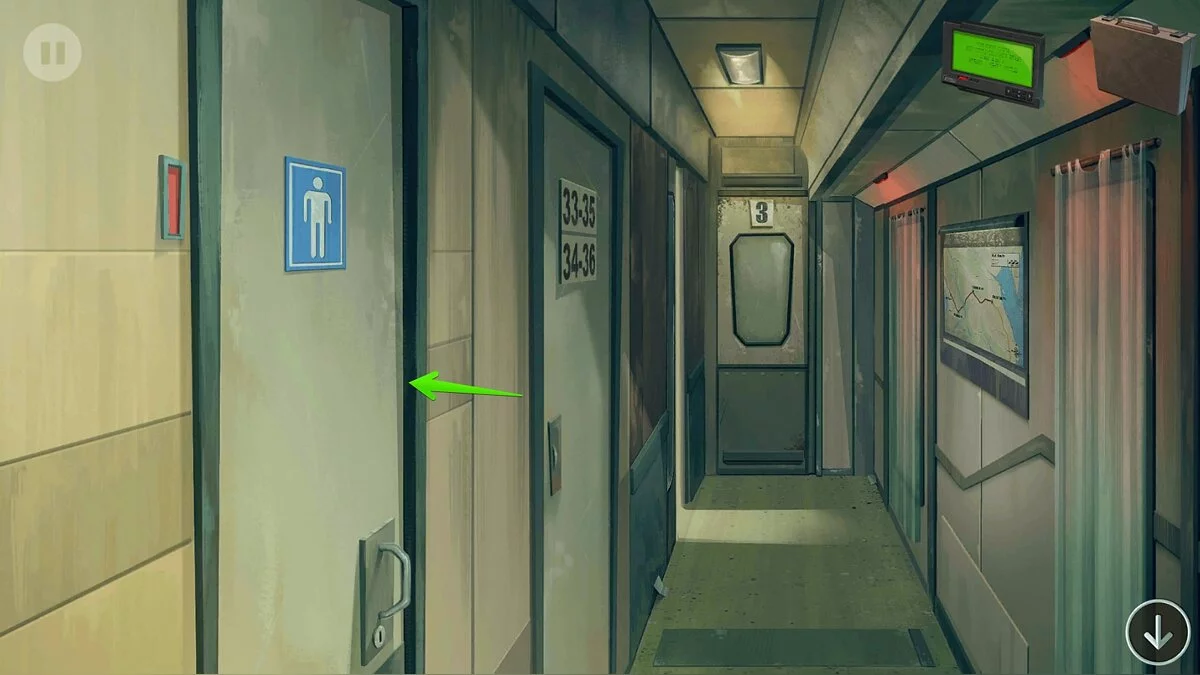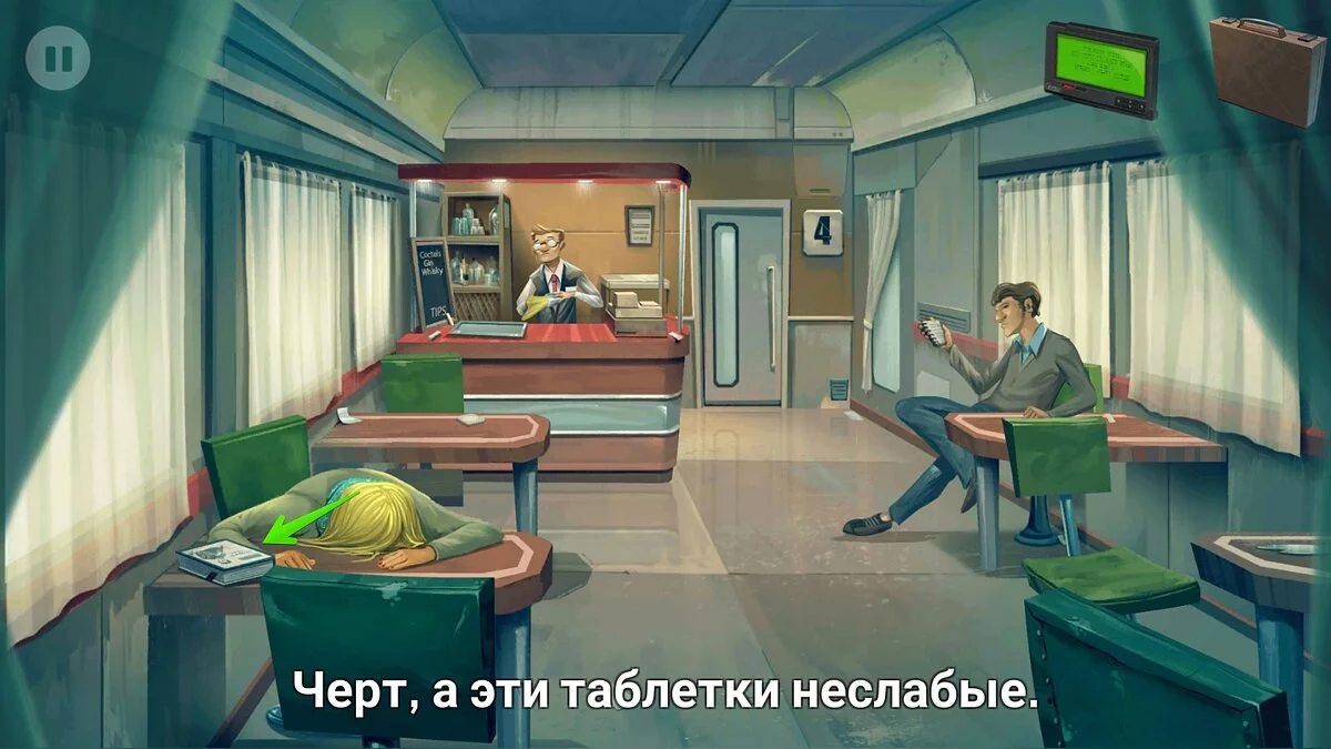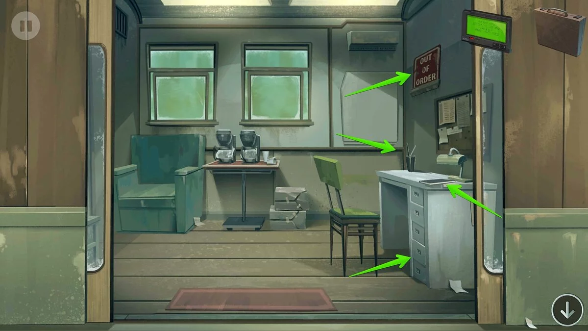 Пройдите в третий вагон. Дальняя дверь слева — офис. Сообщите о том, что женский туалет заливает. Бегите во второй вагон. Возьмите со стола кепку, из рюкзака таблетки и деньги. В выдвижном ящике заберите чемодан. Закройте ящик.
