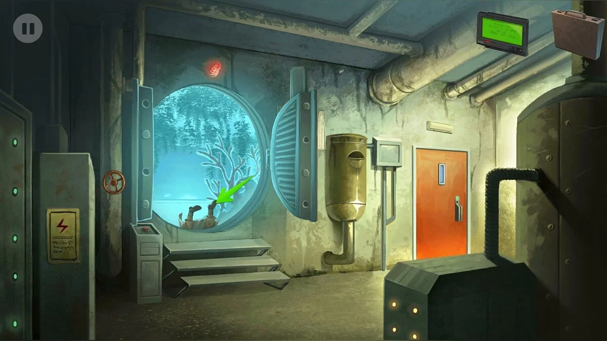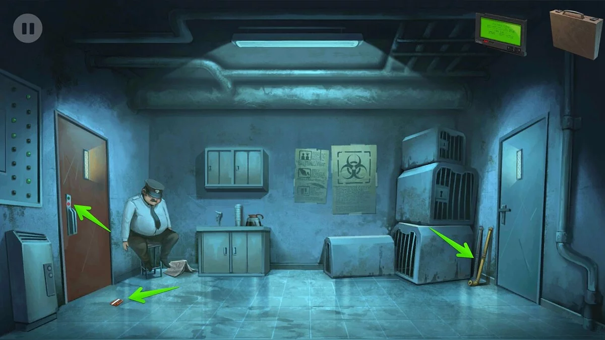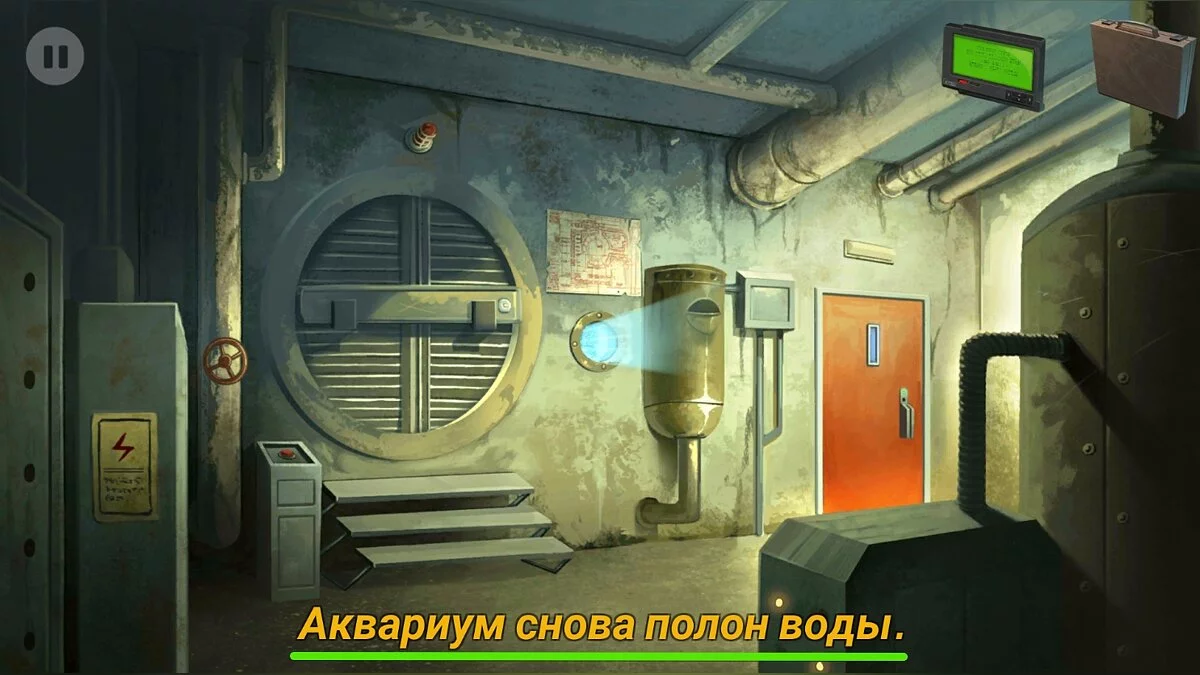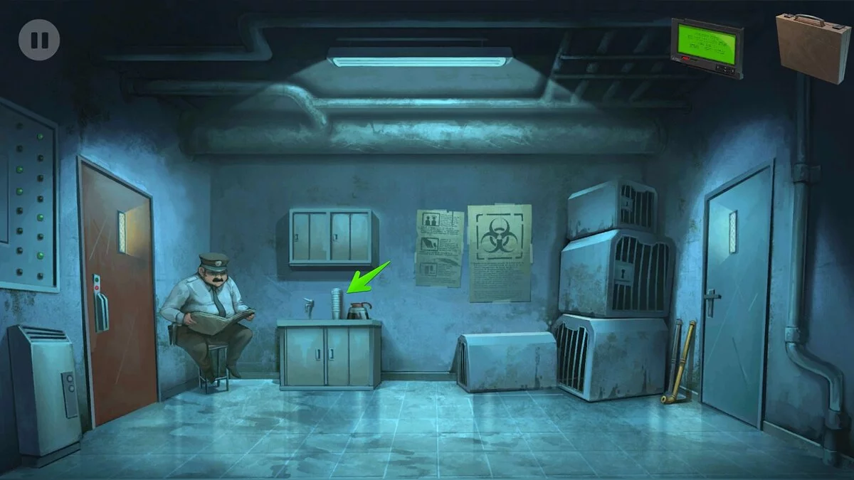 Слева сидит охранник. Забираем чашку кофе. Объединяем кофе с пипеткой, получаем «кофе с веществом». Ставим стакан на свое место. Охранник выпьет его и уснет. Подбираем трубу и пропуск под охранником. Используем пропуск на запертой двери, заходим в комнату управления аквариумом.