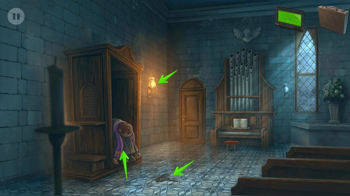 Появляемся в церкви. На полу подбираем зелёное распятие и тело. Здесь же берём лампочку на стене. Направляемся в коридор и заходим в дверь справа, в комнату с книгами. Находим перчатки, шестигранник и взаимодействуем со шкатулкой.