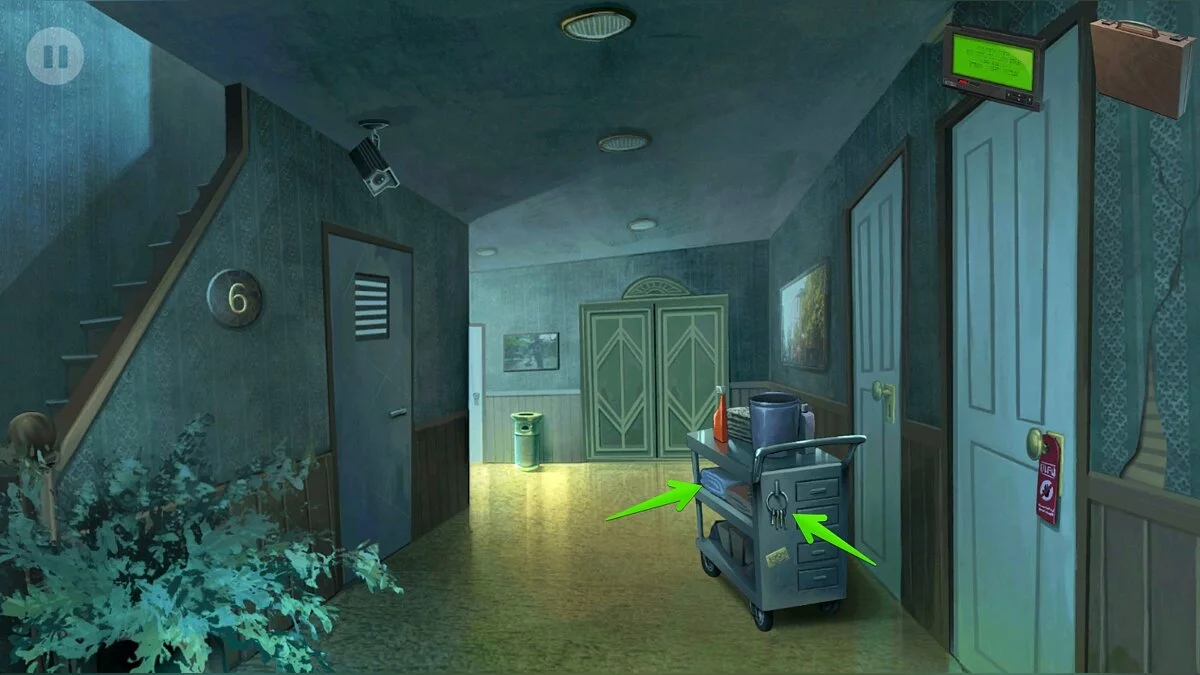 Возвращаемся на этаж, забираем ключи на тележке уборщика и открываем ими дверь слева. В тележке также воруем покрывало. Ключи возвращаем обратно и заходим в дверь. В выдвижном ящике подбираем предохранитель, используем пассатижи на ручку крана, чтобы забрать её.
