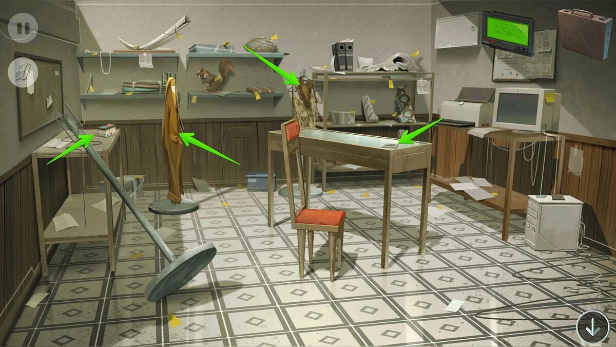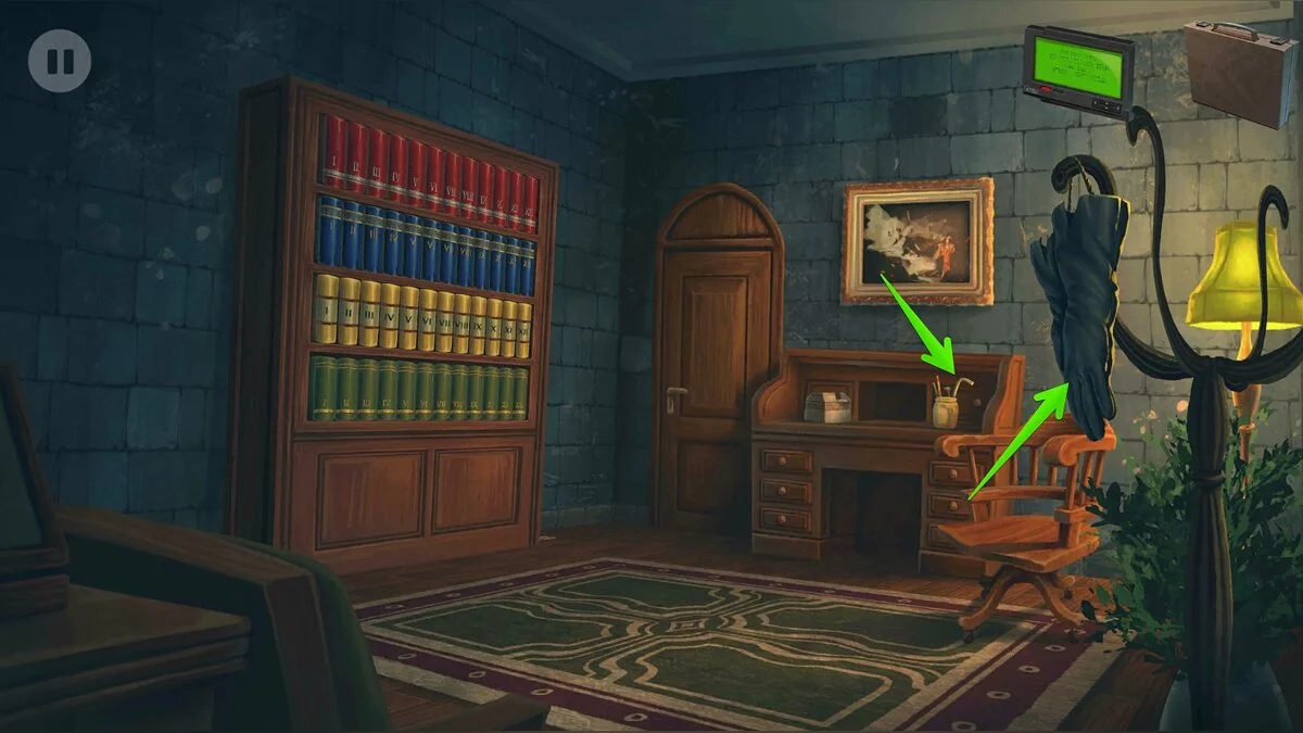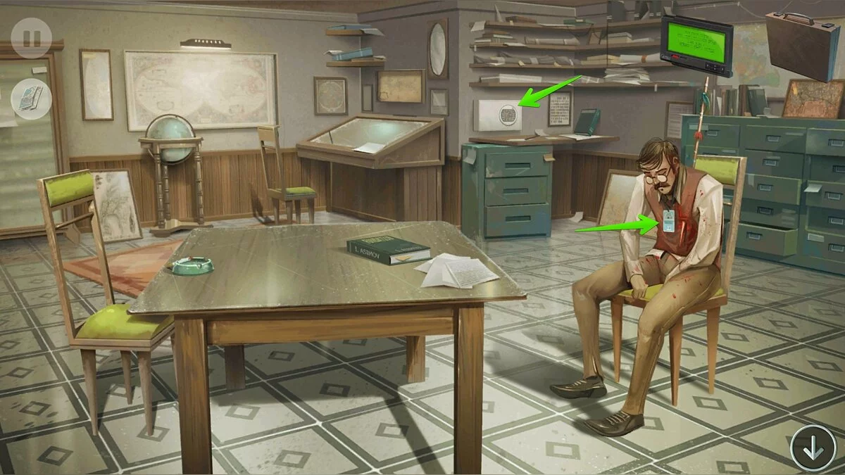 - В кабинете кладём на места перчатки и шестигранник. Передвигаем на место книжный шкаф.