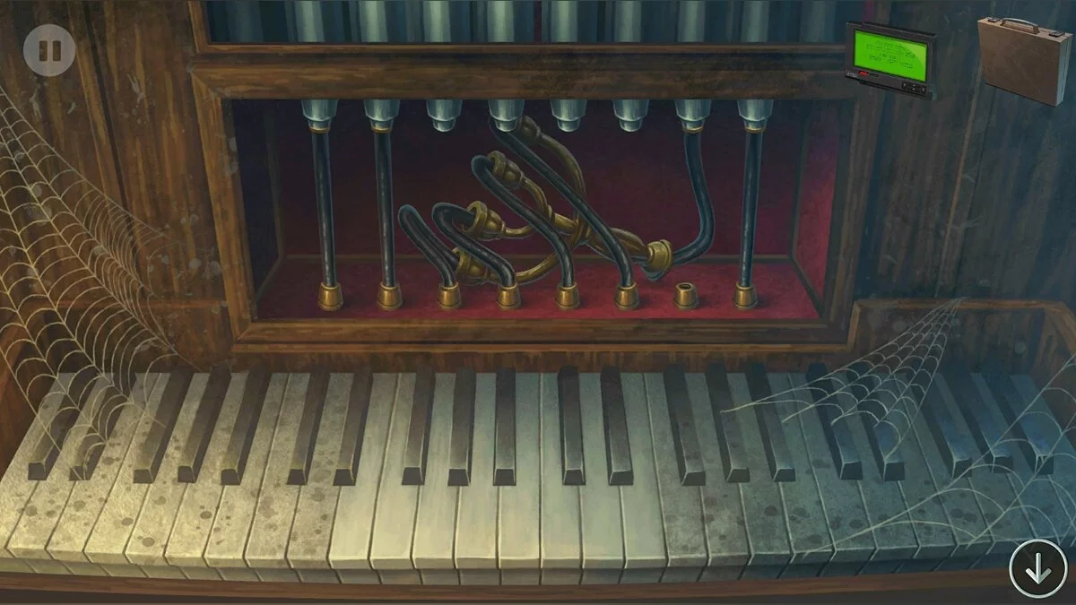 Используем шестигранник на органе, видим восемь шлангов. Подключаем канделябр к седьмому шлангу слева (или второму справа). Нажимаем на клавиши. Из органа вылетает бумажка. Переходим в правую часть зала, главным ключом открываем стеклянную дверь и забираем сердце-самоцвет.