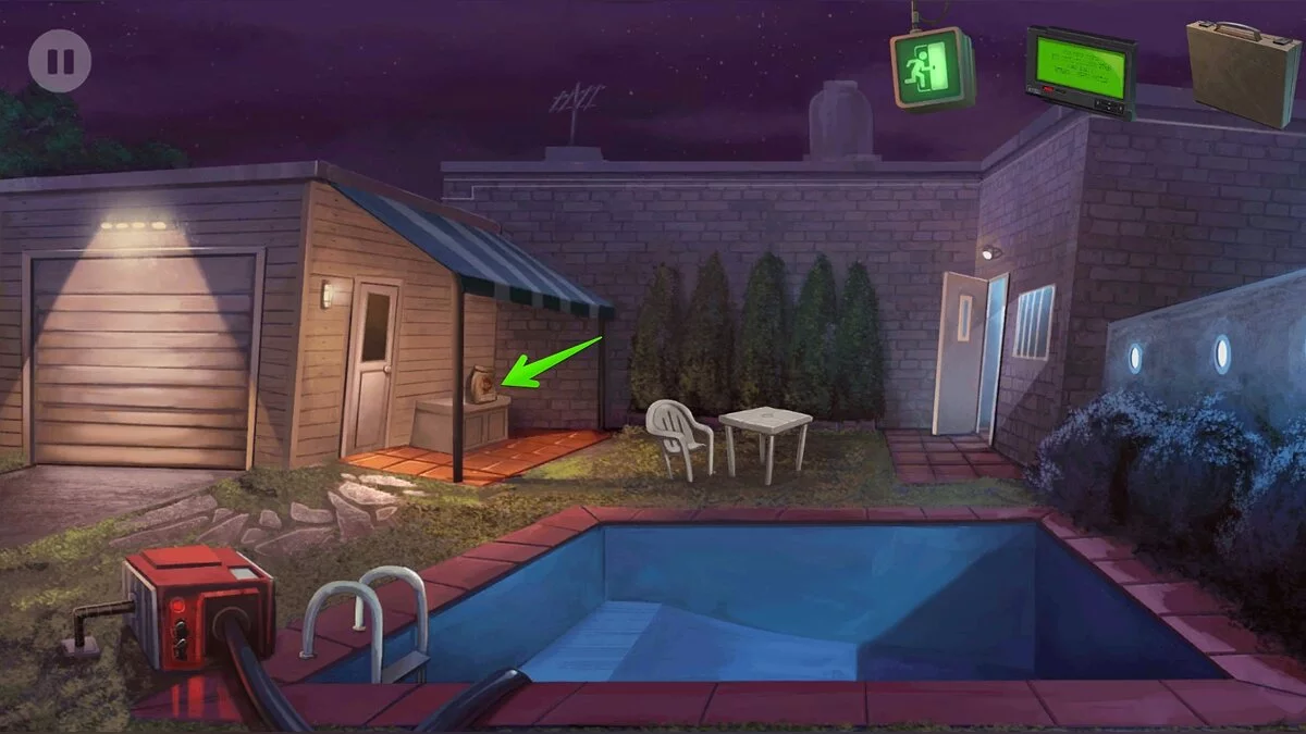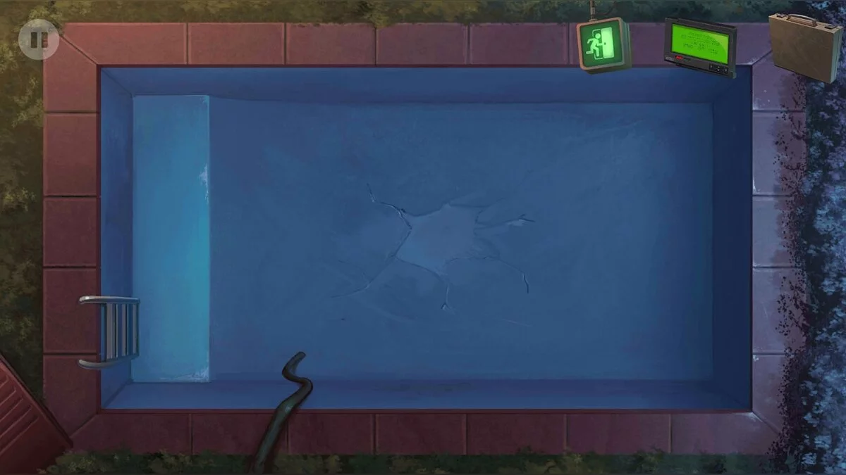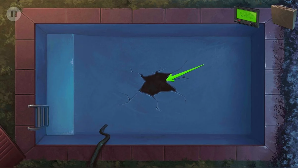 Соединяем провода, помпа откачивает воду из бассейна. Взаимодействуем с бассейном, применяем на него кирку. В отверстие помещаем тело. Рядом с входом в гараж подбираем мешок с цементом. В инвентаре объединяем цемент и воду, и полученным раствором заделываем дыру в бассейне (не забываем предварительно положить сюда тело). Применяем краску и активируем помпу.