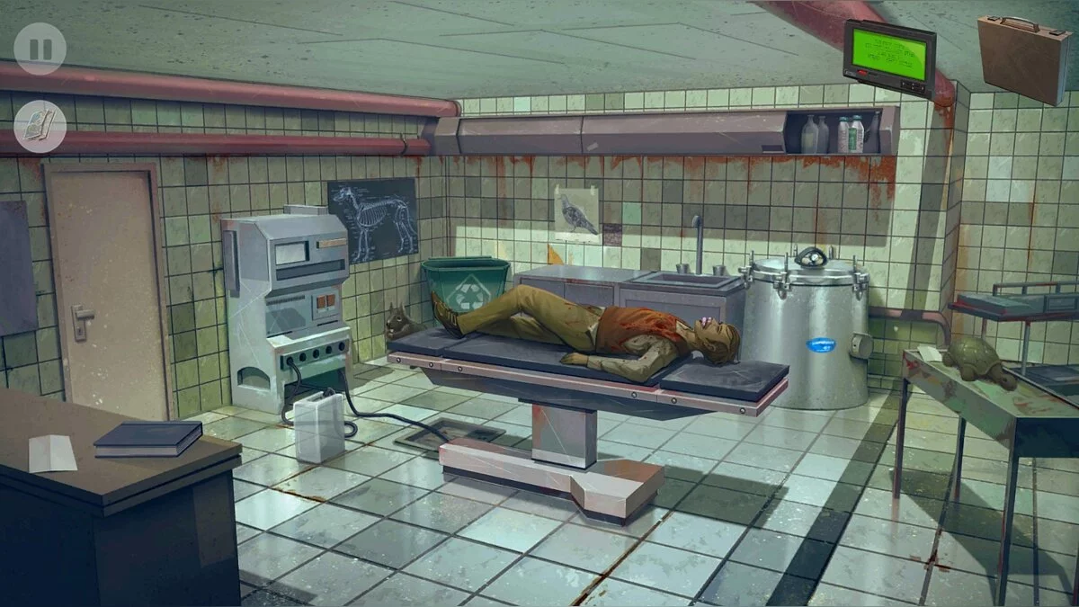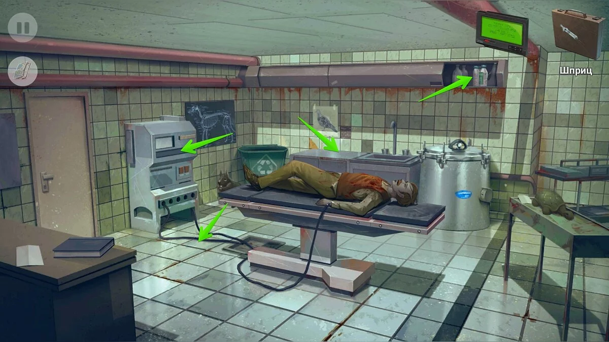 Возвращаемся и забираем тело жертвы. Применяем пропуск на двери слева, кладем труп на стол. Забираем шприц на столе и формальдегид с верхней полки. Подсоединяем шланг к трупу. Включаем помпу, чтобы откачать кровь. Выливаем её в раковину.