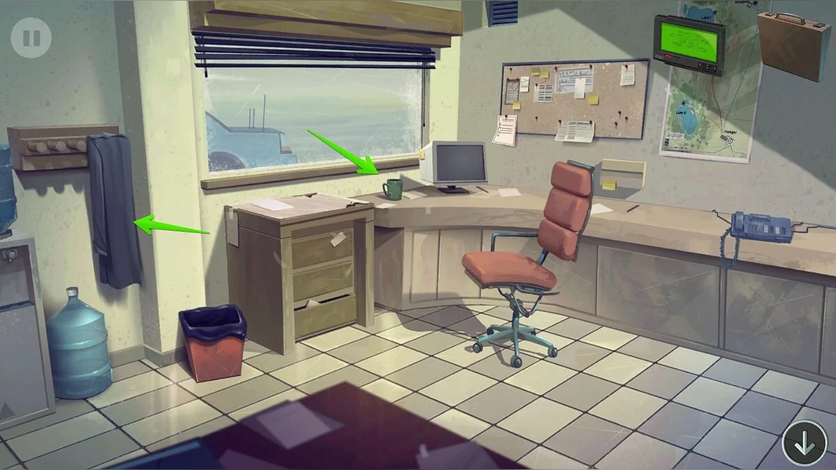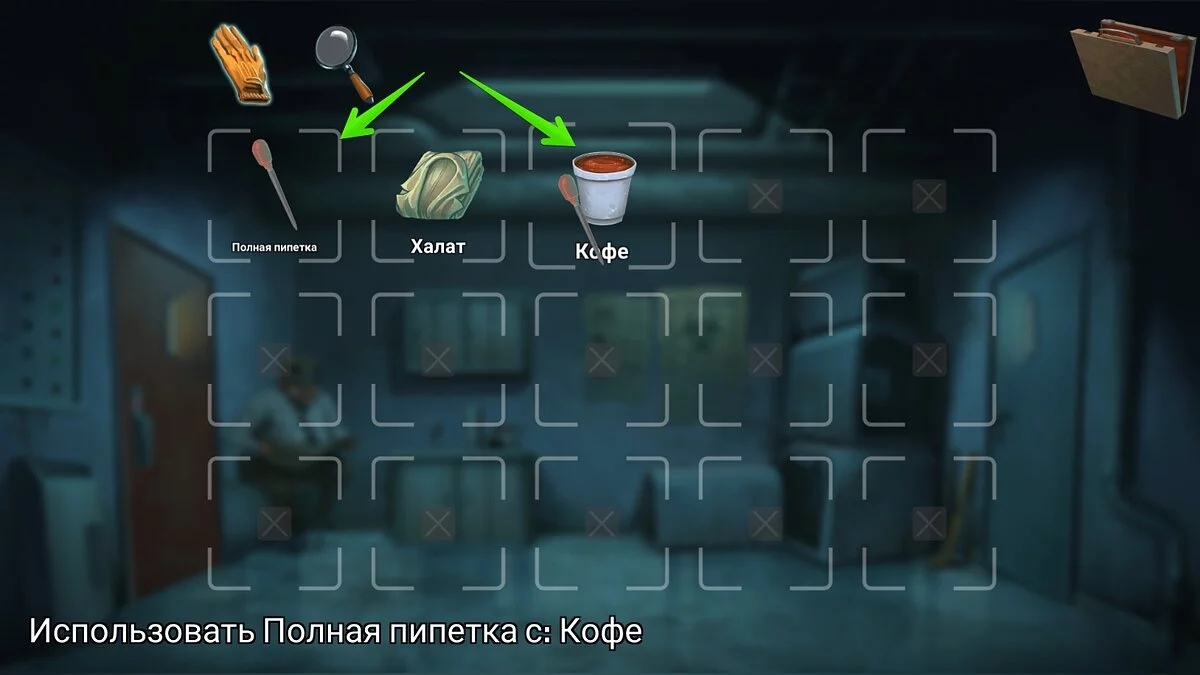 Перемещаемся влево и объединяем уголь с автомобилем. Охранник отвлечется, а мы проберёмся в офис. На стене читаем список дел. Осматриваем плащ и находим запрещённые вещества. Подмешиваем их в кружку на столе.