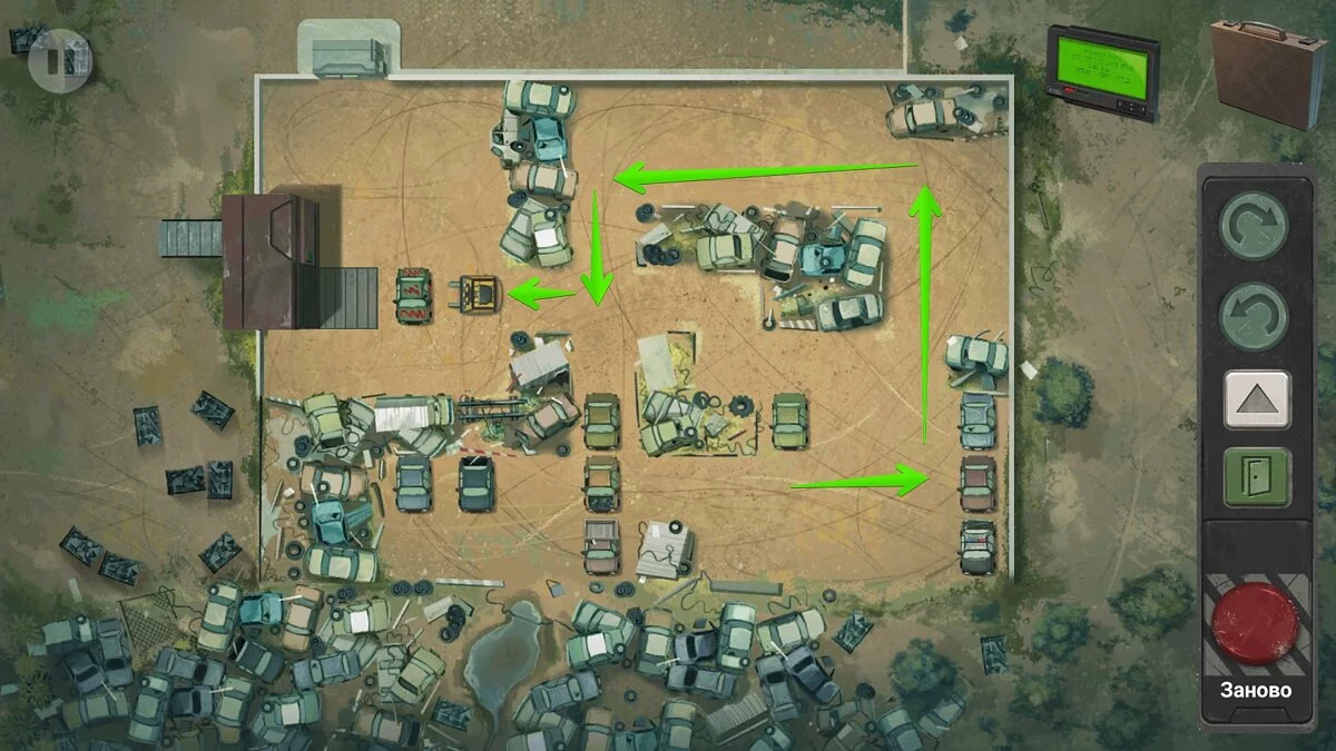 Применяем аккумулятор на погрузчик, после чего предстоит решить небольшую головоломку. Нужно погрузить раскрашенную машину в утилизатор. Должно получиться так же, как показано на скриншоте ниже. Когда машина будет на конвейере, подъезжаем к блоку управления и вставляем ключ в замок. Сперва открываем ворота (зелёная кнопка), затем включаем утилизатор.