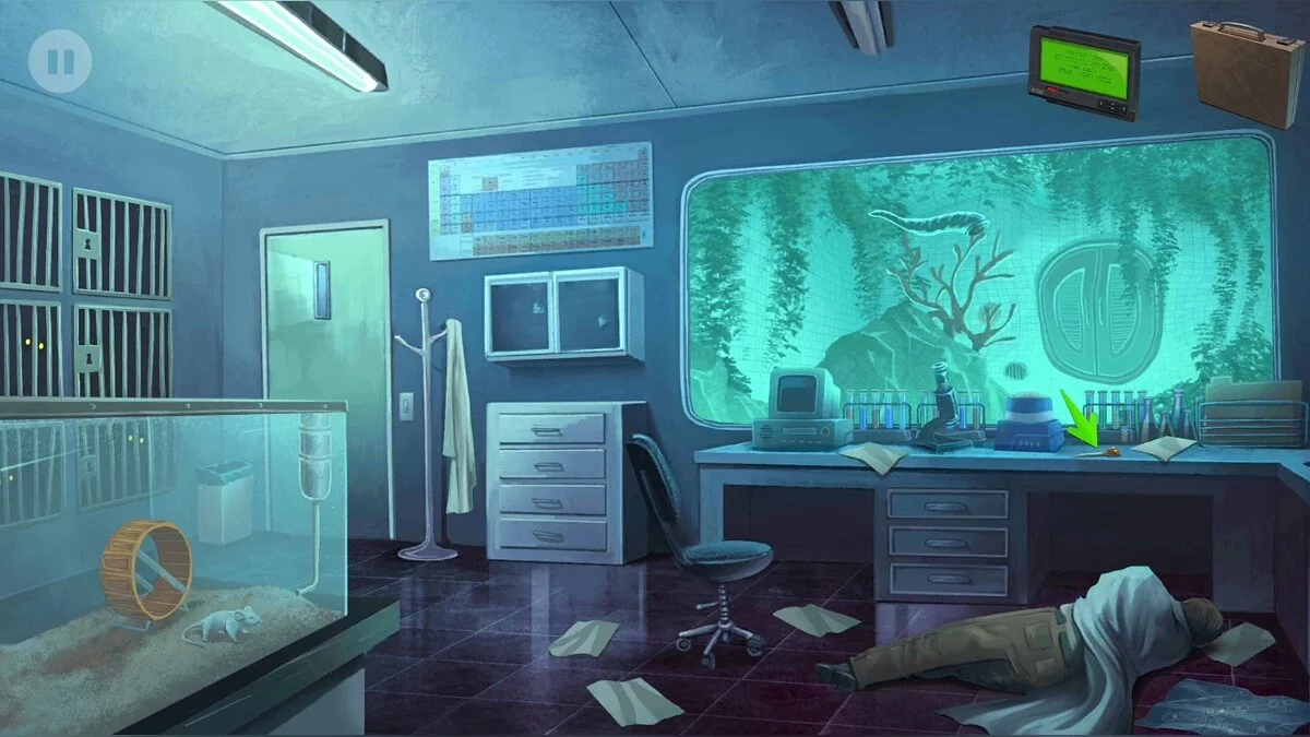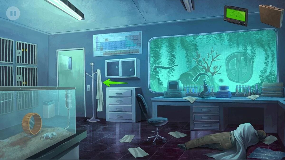 Берем в руку трубу желтого цвета, используем её на вентиле слева. Открываем аквариум, возвращаемся в лабораторию и подбираем тело. Кидаем его в аквариум, закрываем ставни. Поворачиваем вентиль до тех пор, пока не будет написано «Аквариум снова полон воды».