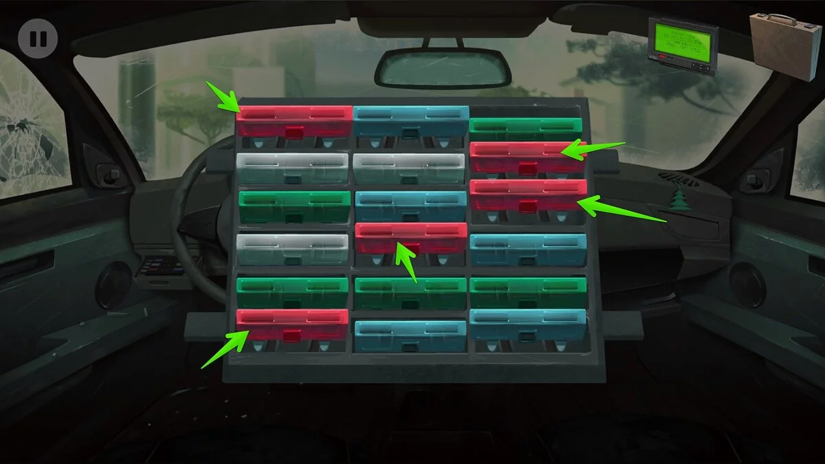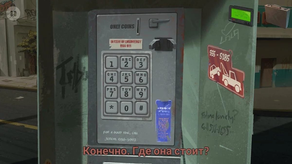 Здесь же активируем все предохранители других цветов. Так сможем открыть багажник. Помещаем сюда туда тело жертвы. В бардачке берём монеты. Используем их в таксофоне и набираем номер «555-5185», чтобы вызвать эвакуатор.