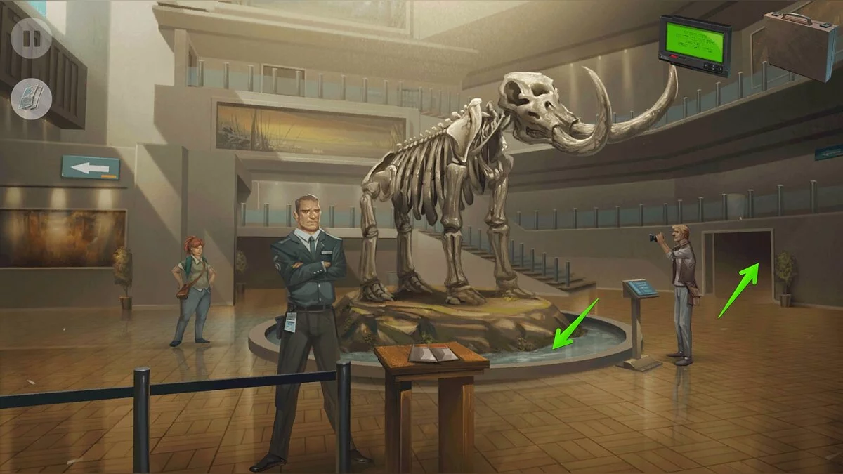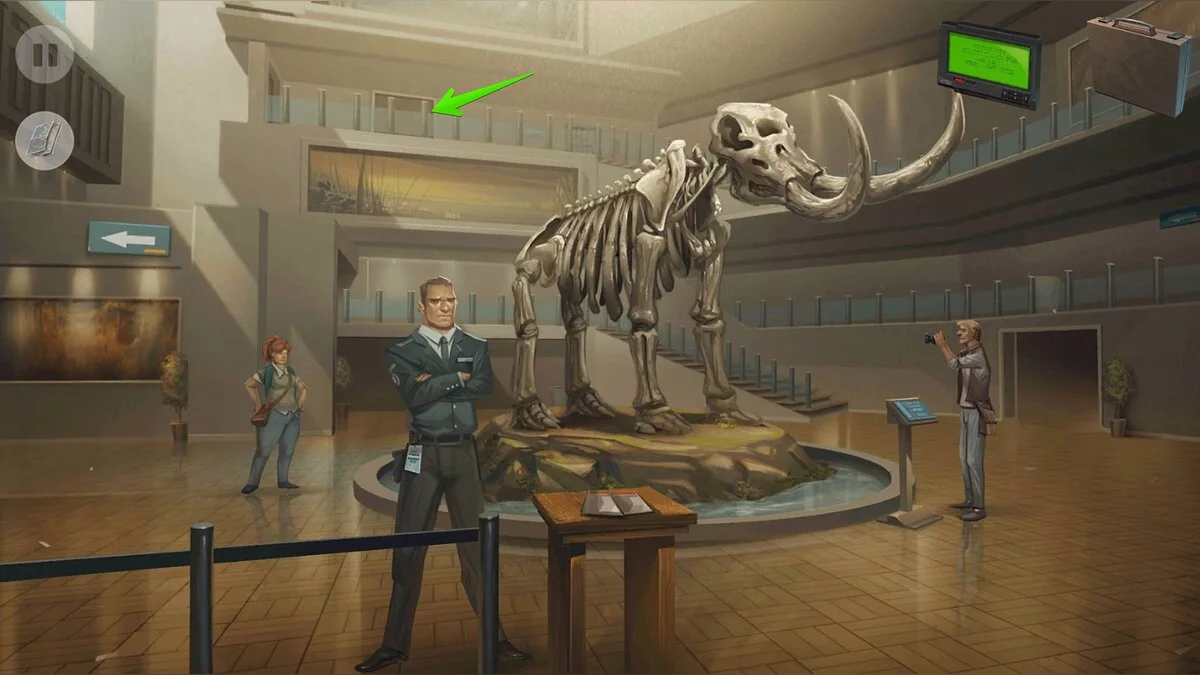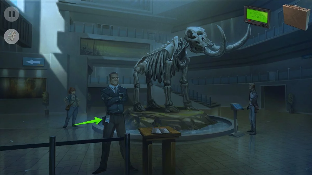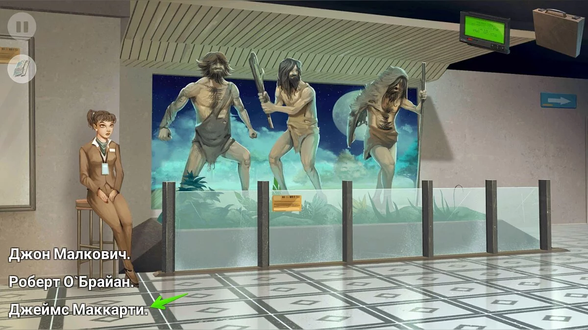 Проходим через центральный зал и поднимаемся на третий этаж. Пытаемся заменить одного из пещерных людей, но в этот момент начнётся диалог с работником музея. Отвечаем «Джеймс Маккарти». Помещаем дубину в руку жертвы.