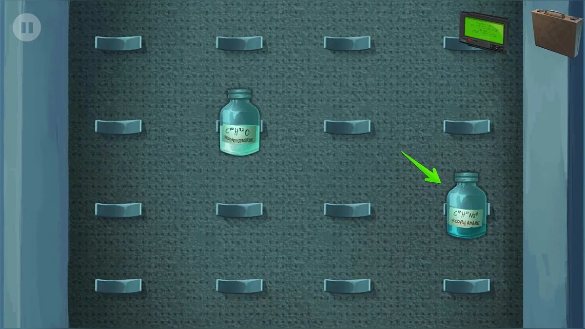 Забираем пипетку со стола. Открываем ящик на стене слева от стола и осматриваем две банки. Используем пипетку на депрессанте. Надеваем халат и покидаем комнату.