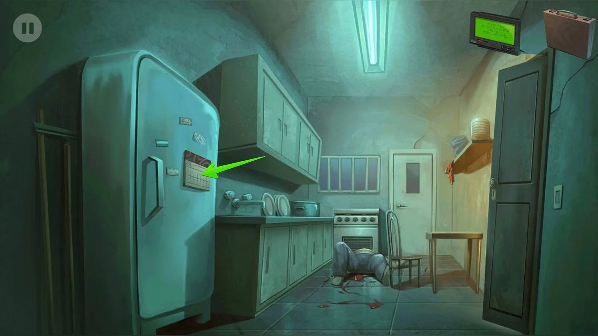 Отправляемся на кухню (дверь слева). Осматриваем календарь, запоминаем дату рождения (6684). Возвращаемся в прихожую, нажимаем на картину и открываем сейф при помощи этого пароля.