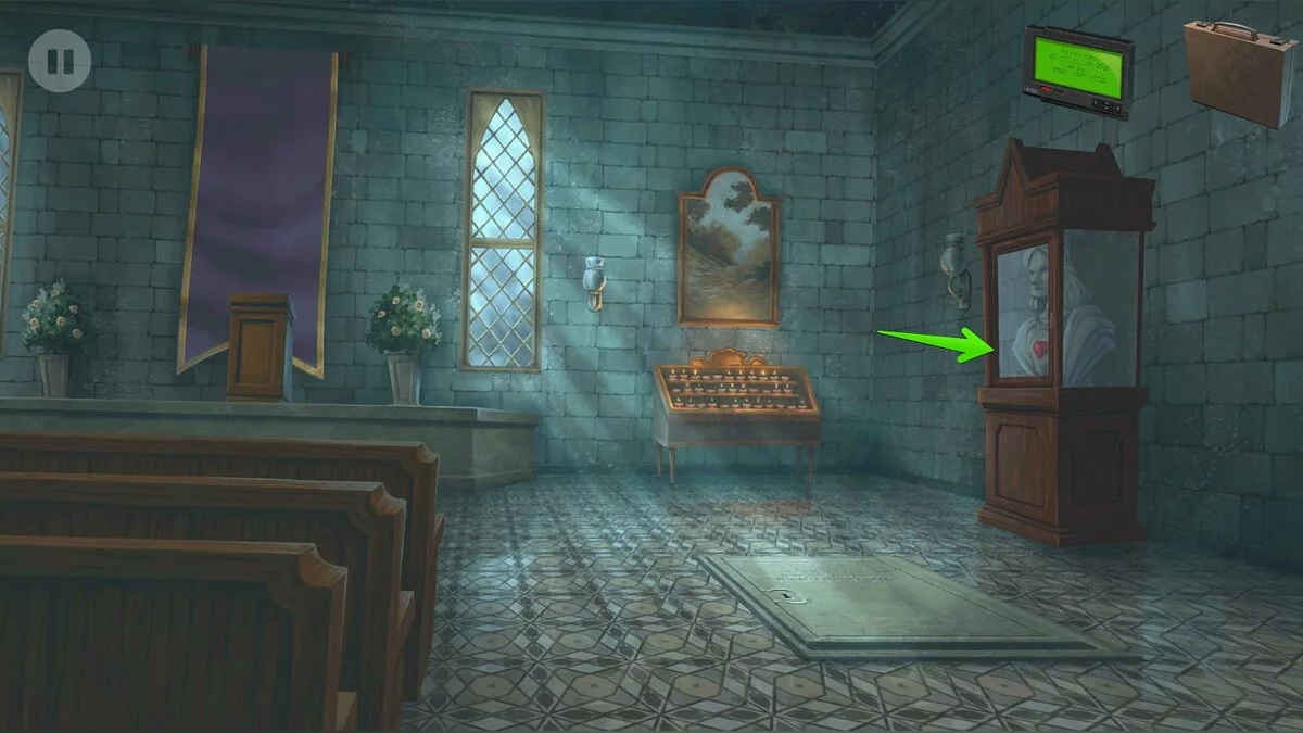 - В главном зале помещаем бумагу в орган, закрываем его шестигранником. Вставляем самоцвет в статую, кладём зелёное распятие на пол. Лампочку вкручиваем в светильник.