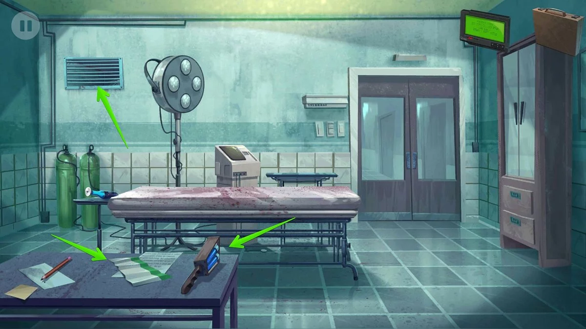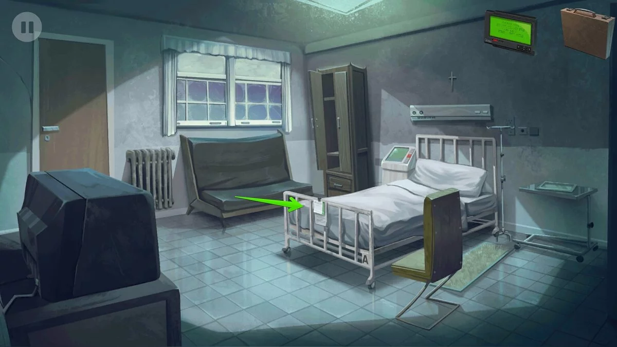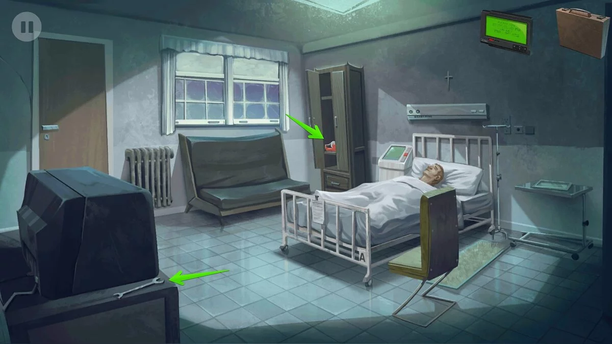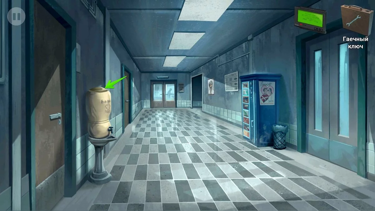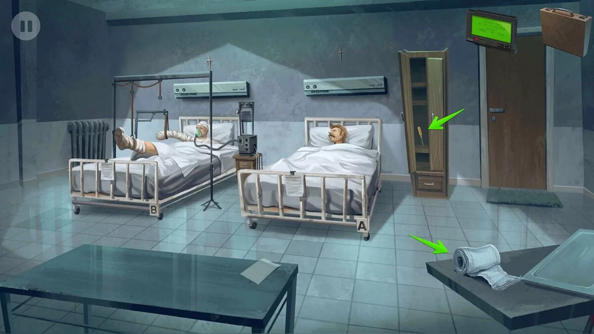 Поговорите с медсестрой и пройдите в дверь прямо. В первой палате заберите гаечный ключ и изоленту со шкафа. В коридоре снимите крышку (кепка) с бака для воды. Во второй палате возьмите бинт и отвёртку в шкафу.