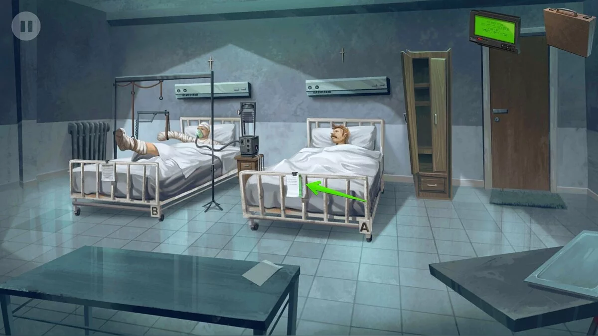 Сейчас вы можете взять только два свидетельства. Третье пока останется в терминале. Следуйте в палату с двумя пациентами и прикрепите свидетельство о выписке (зелёное) к пациенту справа (маркировка «А»). Бегите в первую палату, возьмите тело и положите его на место, где лежал выписанный пациент. Прикрепите к кровати свидетельство о смерти (красное). Обязательно перебинтуйте лицо жертвы!