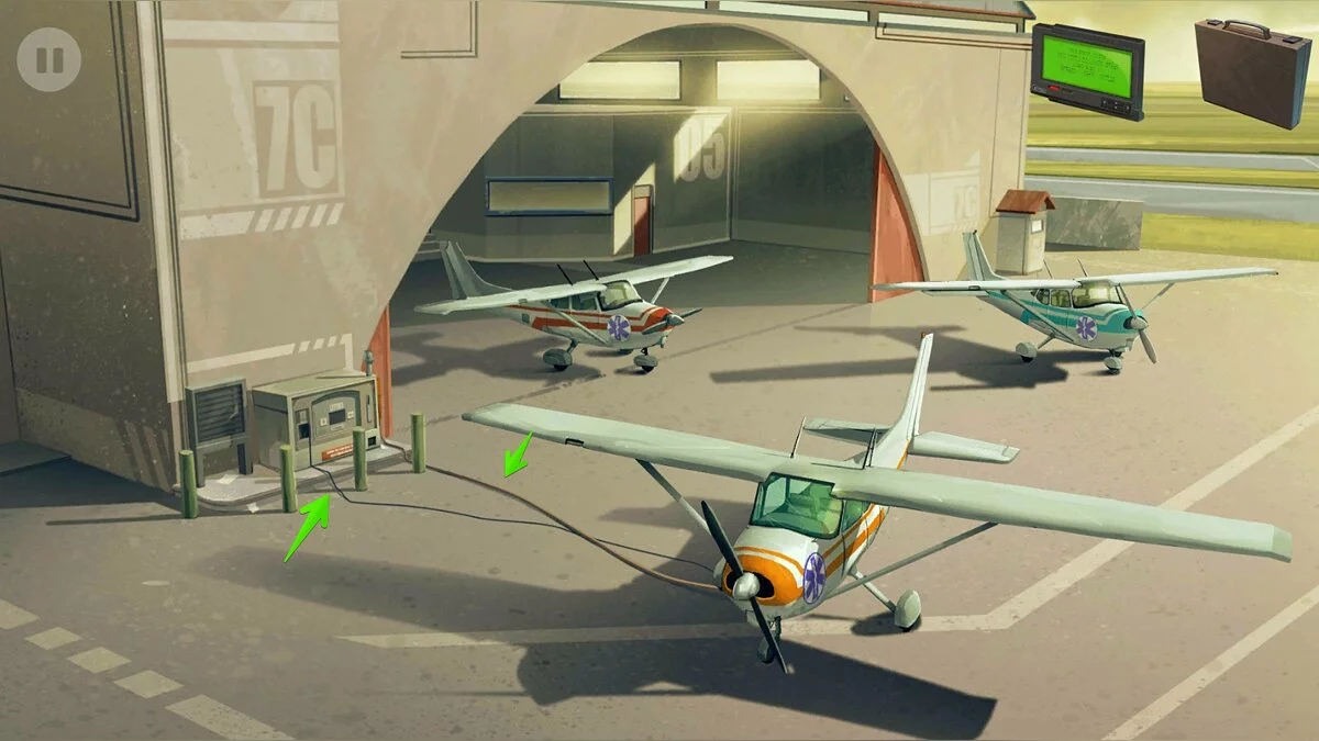 Подбираем нож и следуем вправо. Заходим на территорию через ворота. Здесь видим три самолёта, которые нужно заправить. Для этого подсоединяем к каждому из них шланг и кабель заземления. Ставим всё на место.