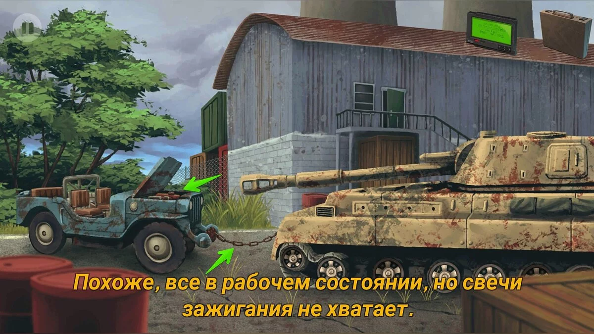 Проходим через литейный цех во внутренний двор. Цепью соединяем УАЗ и танк. Открываем капот, используем свечу на двигатель. Заводим УАЗ отверткой, отгоняем танк. Подбираем с земли гусеницу танка. Открываем бензобак, вставляем в него шланг. На конце шланга ставим банку и наполняем её бензином. Получаем банку с бензином. В неё же вставляем веревку. Возвращаемся в вертолет.
