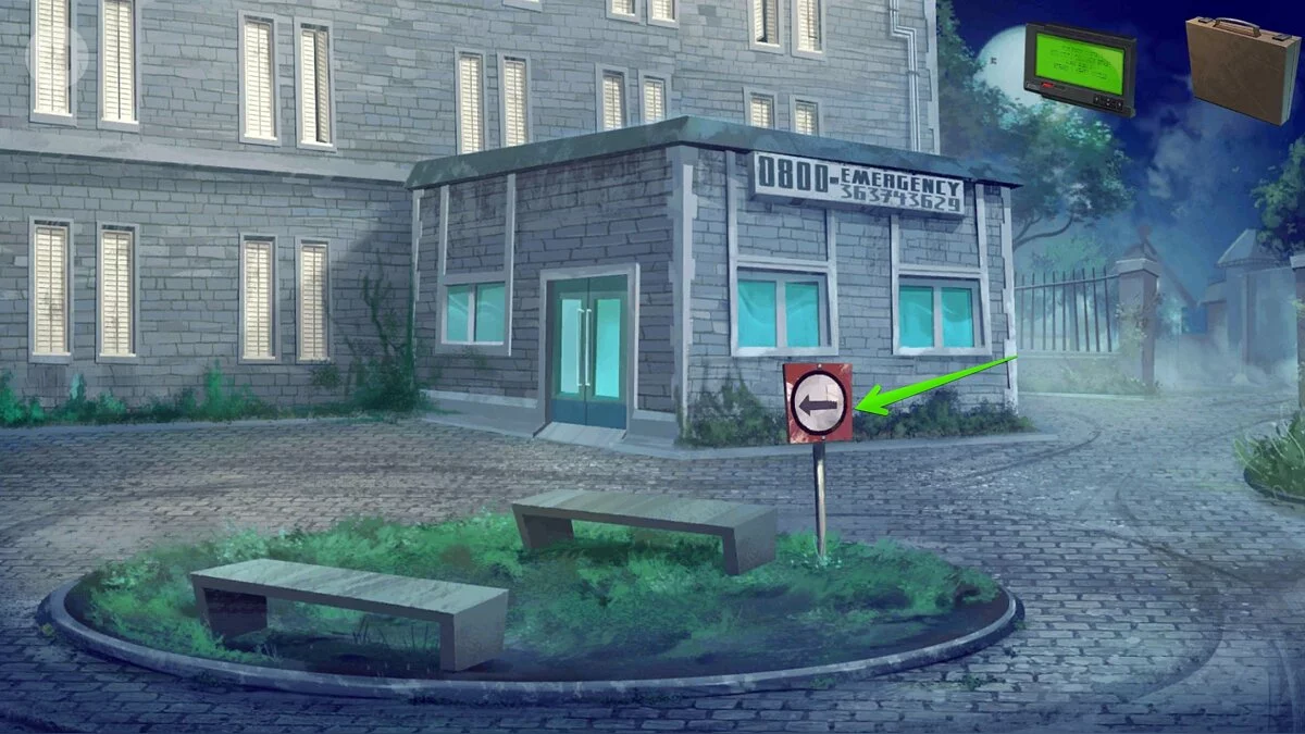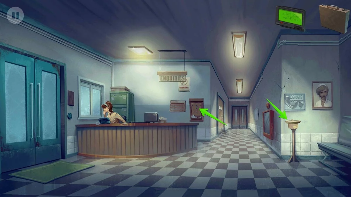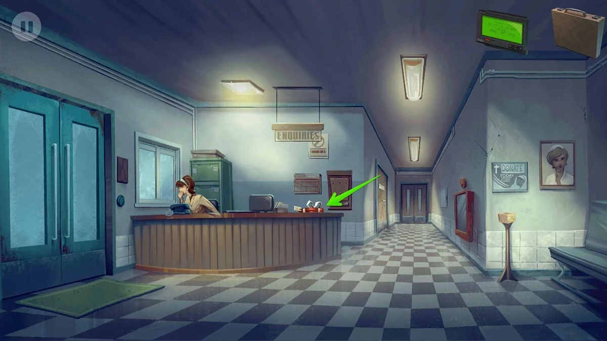 Вернитесь в холл. Поместите крышку бака на ящик для пожертвований. На улице скотчем заклейте знак и переверните его при помощи гаечного ключа. Войдите и выйдите. Медсестра отвернётся, можно подобрать ключ, монету и крышку бака.