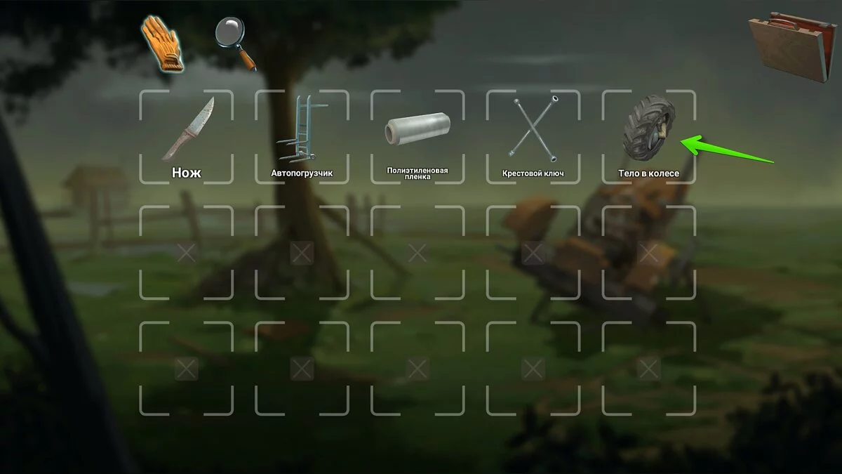 Возвращаемся к жертве. Применяем ключ на колесо трактора, заворачиваем труп в плёнку и кладём внутрь. Перемещаем тело на взлётную полосу. Теперь отделяем жертву от колеса и помещаем его в красный самолёт вместе с ножом.