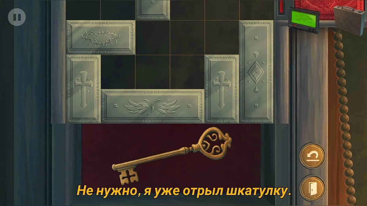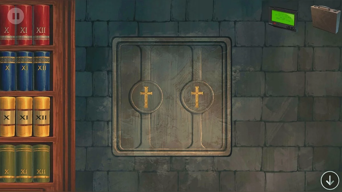 Возвращаемся в кабинет, используем полученную комбинацию на книгах. Стеллаж отодвинется. Вставляем в барельеф два распятия: зелёное — слева, красное — справа. Поворачиваем оба распятия, открываем проход в склеп.