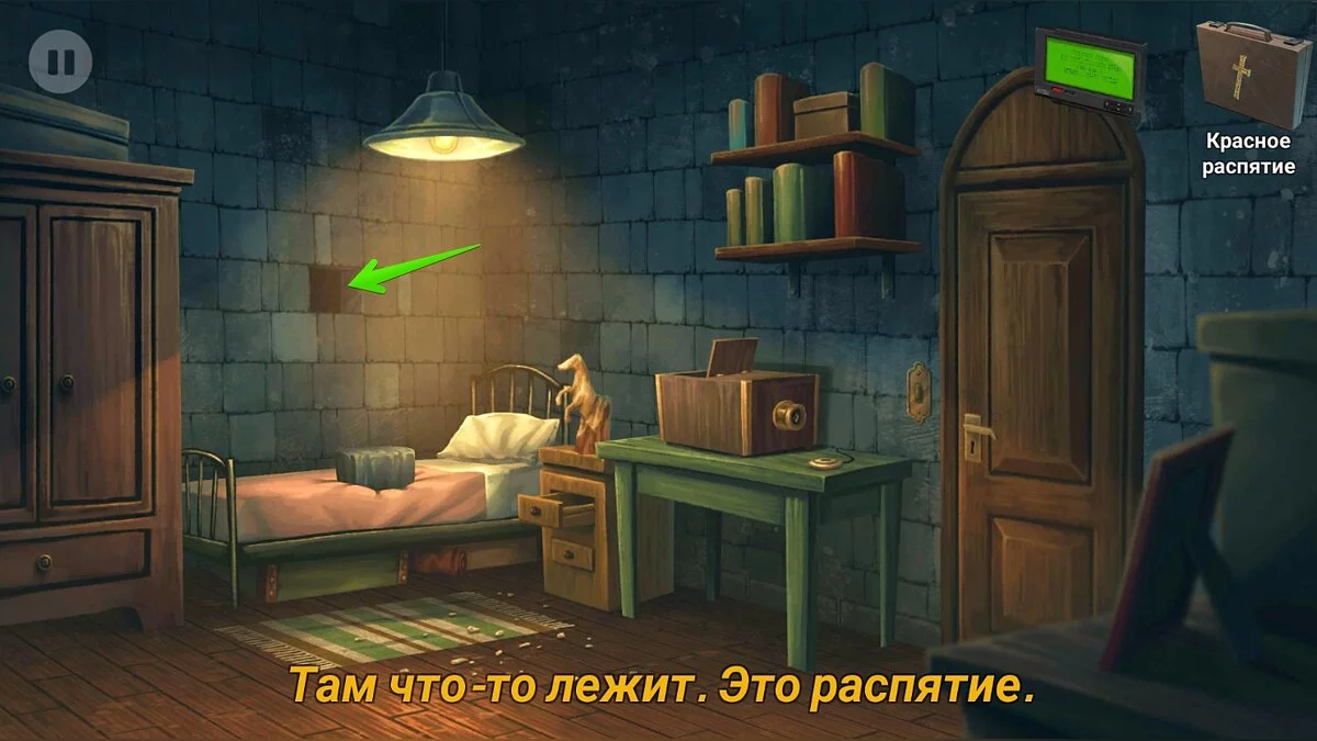 На полу поднимаем долото, письмо на столе, нож в выдвижном шкафу и зеркало на стене. Используем долото на стене у кровати, осматриваем дыру и забираем красное распятие. Возвращаемся в главный зал церкви.