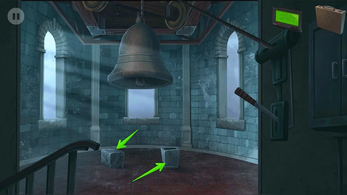 Выходим в коридор, отправляемся на колокольню. Передвигаем камень под колокол, рядом ставим цветочный горшок. Опускаем колокол, используем нож на верёвке. Забираем верёвку в инвентарь и возвращаемся в главный зал. Спускаемся в склеп. Используем верёвку на системе воротов, затем применяем перчатки на верёвку.